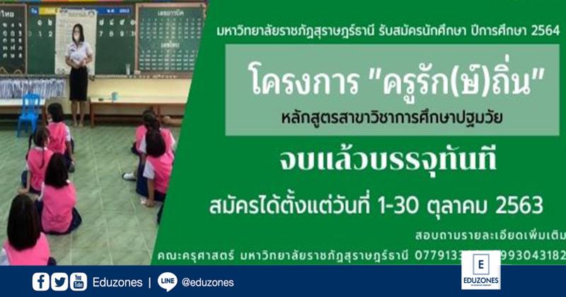 EZ Webmaster October 24, 2020 EZ Webmaster October 24, 2020 จบแล้วบรรจุทันที! โครงการครูรัก(ษ์)ถิ่น ม.ราชภัฏสุราษฎร์ธานี เปิดรับสมัครตั้งแต่วันที่ 1-30 ต.ค. 63 ขอเชิญผู้ที่สนใจสมัครเข้าร่วมโครงการครูรัก(ษ์)ถิ่น ปีการศึกษา 2564 ในหลักสูตรสาขาวิชาการศึกษาปฐมวัย คณะครุศาสตร์ มหาวิทยาลัยราชภัฏสุราษฎร์ธานี สำหรับทุนนี้ กสศ.สนับสนุนทุนการศึกษา ค่าครองชีพ ค่าอุปกรณ์การเรียน ค่าธรรมเนียมการศึกษา ค่าที่พัก ฯลฯ ตลอดหลักสูตร โดยเมื่อสำเร็จการศึกษาแล้วสามารถบรรจุเป็นข้าราชการครู ตำแหน่งครูผู้ช่วยในภูมิลำเนา ตามโครงการสร้างโอกาสทางการศึกษาสำหรับนักเรียนในพื้นที่ห่างไกลเป็นครูรุ่นใหม่เพื่อพัฒนาคุณภาพโรงเรียนของชุมชน ครูรัก(ษ์)ถิ่น ปีการศึกษา 2564 จำนวนรับ -22 ทุน คุณสมบัติของผู้สมัคร -เป็นผู้มีสัญชาติไทย -เป็นผู้สำเร็จการศึกษาชั้นมัธยมศึกษาปีที่ 6 หรือเทียบเท่า ในปีการศึกษา 2563 -เป็นผู้มีเกรดเฉลี่ยสะสม 5 ภาคเรียนการศึกษาในระดับชั้นมัธยมศึกษาตอนปลาย ไม่ต่ำกว่า 2.50 -เป็นผู้อาศัยอยู่ในครอบครัวที่มีฐานะตามเกณฑ์ที่ กสศ. กำหนด -เป็นผู้มีบิดา หรือมารดา หรือผู้ปกครองและผู้ขอรับทุน มีภูมิลำเนาอยู่ในเขตตำบลซึ่งเป็นที่ตั้งของโรงเรียนพื้นที่ห่างไกลที่ผู้รับทุนจะไปบรรจุและแต่งตั้งหลังสำเร็จการศึกษาในปี พ.ศ.2567 มาแล้วไม่น้อยกว่า 3 ปี ติดต่อกัน จังหวัดสุราษฎร์ธานี ประกอบด้วยตำบลที่อยู่ในอำเภอต่อไปนี้ -อำเภอสมุย ตำบลอ่างทอง ตำบลบ่อผุด ตำบลหน้าเมือง ตำบลลิปะน้อย ตำบลแม่น้ำ และตำบลมะเร็ต -อำเภอพะงัน ได้แก่ ตำบลบ้านใต้ -อำเภอท่าชนะ ได้แก่ ตำบลคลองพา จังหวัดกระบี่ ประกอบด้วยตำบลที่อยู่ในอำเภอต่อไปนี้ -อำเภอเกาะลันตา ได้แก่ ตำบลคลองยาง ตำบลเกาะลันตาน้อย และตำบลศาลาด่าน จังหวัดพัทลุง ประกอบด้วยตำบลที่อยู่ในอำเภอต่อไปนี้ -อำเภอปากพะยูน ได้แก่ ตำบลเกาะหมาก ตำบลเกาะนางคำ จังหวัดระนอง ประกอบด้วยตำบลที่อยู่ในอำเภอต่อไปนี้ -อำเภอกระบุรี ได้แก่ ตำบลมะมุ -อำเภอเมืองระนอง ได้แก่ ตำบลปากน้ำ -อำเภอละอุ่น ได้แก่ ตำบลบางแก้ว จังหวัดพังงา ประกอบด้วยตำบลที่อยู่ในอำเภอต่อไปนี้ -อำเภอเกาะยาวได้แก่ ตำบลพรุใน งบประมาณสนับสนุนทุนการศึกษา -ค่าธรรมเนียมการศึกษา จำนวน 30,000 บาท/คน/ปี* -ค่าหอพัก จำนวน 2,000 บาท/คน/เดือน* -ค่าครองชีพ จำนวน 6,000 บาท/คน/เดือน* -ค่าตำราและอุปกรณ์การเรียนที่จำเป็น จำนวน 2,000 บาท/คน/เดือน * จ่ายตามจริงตามอัตราที่แต่ละสถาบันกำหนด แต่ไม่เกินวงเงินที่กำหนด ช่องทางการสมัคร -ยื่นสมัครด้วยตนเอง คณะครุศาสตร์ (ชั้น 5 ห้อง ED501) มหาวิทยาลัยราชภัฏสุราษฎร์ธานี 272 ม.9 ต.ขุนทะเล อ.เมือง จ.สุราษฎร์ธาน