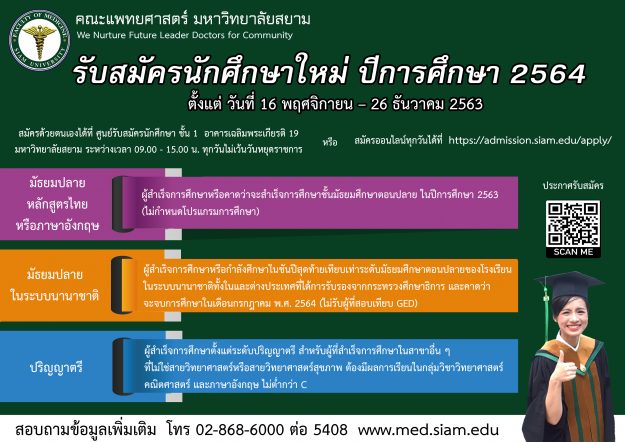 EZ Webmaster November 24, 2020 รับตรง คณะแพทย์ ม.สยาม รอบที่ 1 EZ Webmaster November 24, 2020 ด้วยคณะแพทย์ ม.สยาม กำลังเปิดรับสมัครบุคคลเพื่อคัดเลือกเข้าศึกษาหลักสูตรแพทยศาสตรบัณฑิต ปีการศึกษา 2564 รอบที่ 1 ระหว่างวันที่ 16 พ.ย. – 26 ธ.ค. 63 โดยเปิดรับสมัคร 2 ช่องทาง คือ 1. สมัครออนไลน์ทุกวันได้ที่ https://admission.siam.edu/apply/ 2. สมัครด้วยตนเองได้ที่ ศูนย์รับสมัครนักศึกษา ชั้น 1 อาคารเฉลิมพระเกียรติ 19 มหาวิทยาลัยสยาม ระหว่างเวลา 09.00 – 15.00… Continue Reading