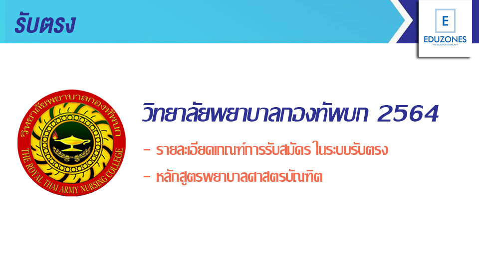 EZ Webmaster December 19, 2020 EZ Webmaster December 19, 2020 #รับตรง64 วิทยาลัยพยาบาลกองทัพบก เปิดรับสมัครนศ.หลักสูตรพยาบาลศาสตรบัณฑิต ตั้งแต่วันที่ 4 ม.ค. – 16 เม.ย. 64 วิทยาลัยพยาบาลกองทัพบก เปิดรับสมัครคัดเลือกบุคคลเพื่อเข้าเป็นนักเรียนพยาบาลกองทัพบก หลักสูตรพยาบาลศาสตรบัณฑิต ประจำปีการศึกษา 2564 โดยจะเปิดรับสมัครตั้งแต่วันที่ 4 มกราคม – 16 เมษายน 2564 จำนวนรับ -100 ที่นั่ง ประเภททุนกองทัพบก (เพศหญิง) 20 คน ประเภททุนส่วนตัว (เพศชายไม่เกิน 15 คน เพศหญิงอย่างน้อย 60 คน) 75 คน ประเภททุนองค์การสงเคราะห์ทหารผ่านศึก 5 คน กำหนดการ -เปิดรับสมัครตั้งแต่วันที่ 4 มกราคม – 16 เมษายน 2564 -ประกาศรายชื่อผู้มีสิทธิ์สอบสัมภาษณ์ วันที่ 6 พฤษภาคม 2564 -วันสอบสัมภาษณ์ ติดตามทางเว็บไซต์ -ประกาศรายชื่อผู้มีสิทธิ์เข้าศึกษา วันที่ 28 พฤษภาคม 2564 คุณสมบัติของผู้สมัคร -เป็นผู้ที่มีสถานภาพโสด อายุ 18 – 25 นับถึงวันเปิดภาคการศึกษาของปีที่สมัครฯ (ผู้สมัครที่เกิด 2 ส.ค. 2539 – 2 ส.ค. 2546) -เป็นผู้สำเร็จการศึกษาระดับชั้นมัธยมศึกษาตอนปลาย แผนการเรียนวิทย์ – คณิต -เป็นผู้ที่มีน้ำหนักตัวไม่น้อยกว่า 45 กิโลกรัม ส่วนสูงไม่ต่ำกว่า 155 เซนติเมตร และมีดัชนีมวลกายไม่เกิน 30 กิโลกรัมต่อตารางเมตร -เป็นผู้ที่มีผลการทดสอบทางการศึกษาแห่งชาติ ได้แก่ -ผลคะแนน O-NET 5 รายวิชา ปีการศึกษา 2561, 2562 และ 2563 ต้องมีคะแนนวิชาคณิตศาสตร์ ภาษาอังกฤษ และวิทยาศาสตร์ แต่ละวิชาไม่ต่ำกว่า 30 คะแนน (ถ้าไม่มีผลคะแนน O-NET ปี 2561-2563 ให้ใช้คะแนน 9 วิชาสามัญ ปี 2564 ทั้ง 7 รายวิชา) -ผลคะแนน GAT / PAT 2 ปี 2563, 2564 โดยเลือกคะแนนครั้งที่มากที่สุด ช่องทางการสมัคร -สมัครทางออนไลน์ผ่านเว็บไซต์ https://rtanc.ac.th/ หลักเกณฑ์การพิจารณารับเข้า -ผลการทดสอบทางการศึกษา (O-NET, GAT, PAT, 9 วิชาสามัญ) -การสอบสัมภาษณ์ -การตรวจร่างกาย สำหรับผู้ที่สนใจสมัครเข้าศึกษาสามารถเข้าไปศึกษารายละเอียดเพิ่มเติม ได้ที่ >>> คลิก ขอบคุณข้อมูลจาก -เว็บไซต์วิทยาลัยพยาบาลกองทัพบก