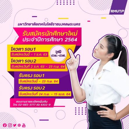 มทร.ธัญบุรี พร้อมปั้นบัณฑิตสู่ยุค NEXT GEN การันตีความสำเร็จด้วยคลื่นมหาชน tui sakrapeeDecember 4, 2025 มหาวิทยาลัยเทคโนโลยีราชมงคลธัญบุรี (มทร.ธัญบุรี) สร้างปรากฏการณ์ครั้งสำคัญในแวดวงการศึกษาไทยผ่านงาน ‘RMUTT NEXT GEN: Open House 2026 : เปิดประตูสู่ราชมงคลธัญบุรี 69’ เมื่อวันที่ 27 และ 28 พฤศจิกายน 2568… ม.กรุงเทพ จัดงาน The Shape of Tomorrow: Bangkok Art & Architecture @Dib Bangkok tui sakrapeeDecember 4, 2025 คณะสถาปัตยกรรมศาสตร์ มหาวิทยาลัยกรุงเทพ จัดงาน “The Shape of Tomorrow: Bangkok Art & Architecture” เปิดพื้นที่แลกเปลี่ยนองค์ความรู้และประสบการณ์ระหว่างนักวิชาการ ผู้เชี่ยวชาญในวงการสถาปัตยกรรมที่มุ่งเน้นแนวคิดการออกแบบที่ตอบโจทย์ความยั่งยืน (Sustainability) และการปรับใช้พื้นที่อาคารให้เกิดคุณค่าใหม่ (Adaptive Reuse) โดยปรับเปลี่ยนพื้นที่เดิมให้กลายเป็นพื้นที่สร้างสรรค์อย่าง… มหาวิทยาลัยราชภัฏสวนสุนันทา จับมือ “เอ็ม พาวเวอร์ คอร์ปอเรชั่น” ลงนาม MOU ขับเคลื่อนระบบจัดการวัสดุรีไซเคิล สู่มหาวิทยาลัยสีเขียวอย่างยั่งยืน tui sakrapeeDecember 4, 2025 เมื่อวันพฤหัสบดีที่ 4 ธันวาคม 2568 มหาวิทยาลัยราชภัฏสวนสุนันทา จัดพิธีลงนามบันทึกความเข้าใจ (MOU) ร่วมกับบริษัท เอ็ม พาวเวอร์ คอร์ปอเรชั่น จำกัด ณ ห้องประชุมสภามหาวิทยาลัย เพื่อขับเคลื่อนการพัฒนาระบบการจัดการวัสดุรีไซเคิลภายในมหาวิทยาลัยอย่างเป็นรูปธรรมและยั่งยืน พิธีลงนามในครั้งนี้มีวัตถุประสงค์เพื่อพัฒนากลไกการจัดการวัสดุรีไซเคิลให้มีประสิทธิภาพยิ่งขึ้น ส่งเสริมการคัดแยกขยะอย่างถูกต้อง เพิ่มคุณค่าและสร้างรายได้จากวัสดุที่สามารถนำกลับมาใช้ใหม่… สุดเจ๋ง! สถานศึกษาอาชีวะ รับรางวัลโครงการชีววิถีฯ ระดับประเทศ ประจำปี 2568 สานต่อปณิธานหลักปรัชญาเศรษฐกิจพอเพียงของพ่อหลวงรัชกาลที่ 9 EZ WebmasterDecember 3, 2025 สุดเจ๋ง! สถานศึกษาอาชีวะ รับรางวัลโครงการชีววิถีฯ ระดับประเทศ ประจำปี 2568 สานต่อปณิธานหลักปรัชญาเศรษฐกิจพอเพียงของพ่อหลวงรัชกาลที่ 9 วันนี้ (1 ธ.ค. 68) นายยศพล เวณุโกเศศ เลขาธิการคณะกรรมการการอาชีวศึกษา มอบหมายให้ นายสง่า แต่เชื้อสาย… Search for: Search Month: December 2020 EZ Webmaster December 22, 2020 มทร.พระนคร เปิดรับสมัครนักศึกษาวุฒิ ปวช.-ปวส. เข้าศึกษาต่อ ป.ตรี (โควตา 2) ประจำปี 2564 EZ Webmaster December 22, 2020 มหาวิทยาลัยเทคโนโลยีราชมงคลพระนคร เปิดรับสมัครผู้ที่สำเร็จการศึกษาระดับประกาศนียบัตรวิชาชีพ (ปวช.) และประกาศนียบัตรวิชาชีพชั้นสูง (ปวส.) เพื่อเข้าศึกษาต่อระดับปริญญาตรี ประเภทโควตา ประจำปีการศึกษา 2564 โดยมีรายละเอียดดังนี้ ระดับ ปวช. ใน 9 คณะ ได้แก่ 1. คณะครุศาสตร์อุตสาหกรรม สาขาวิชาเครื่องกล สาขาวิชาอุตสาหการ สาขาวิชาคอมพิวเตอร์ 2. คณะเทคโนโลยีคหกรรมศาสตร์ สาขาวิชาออกแบบแฟชั่นผ้าและเค