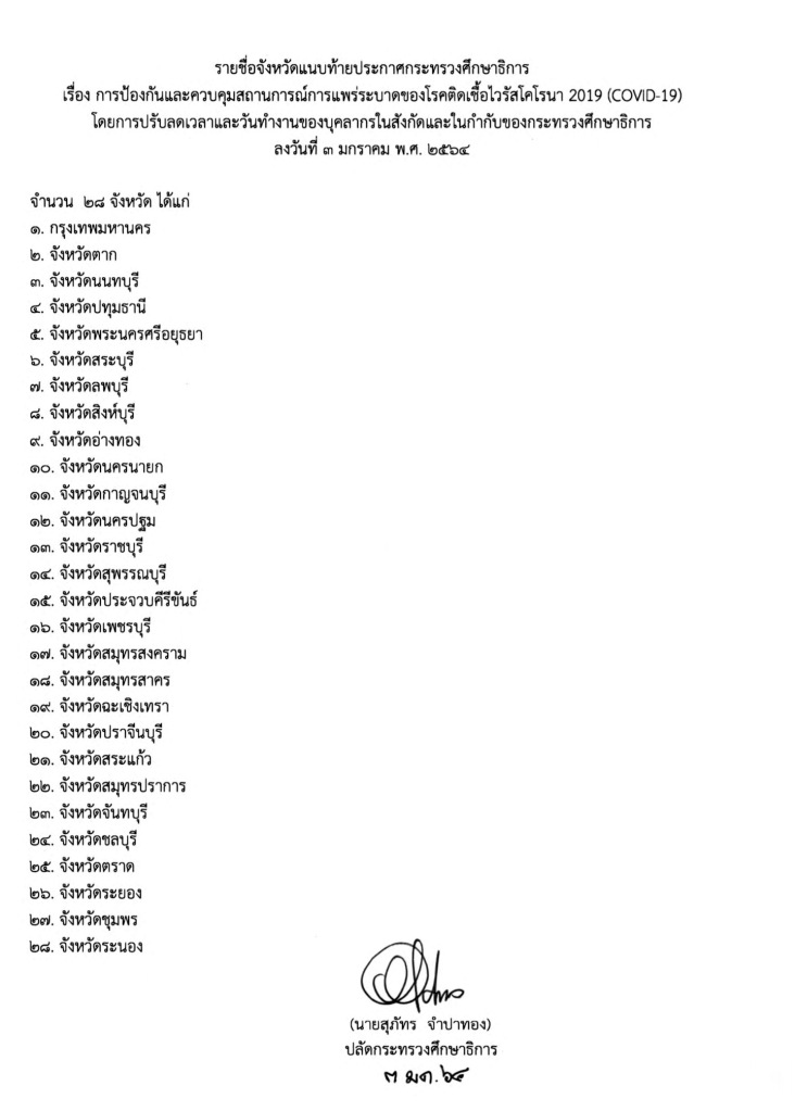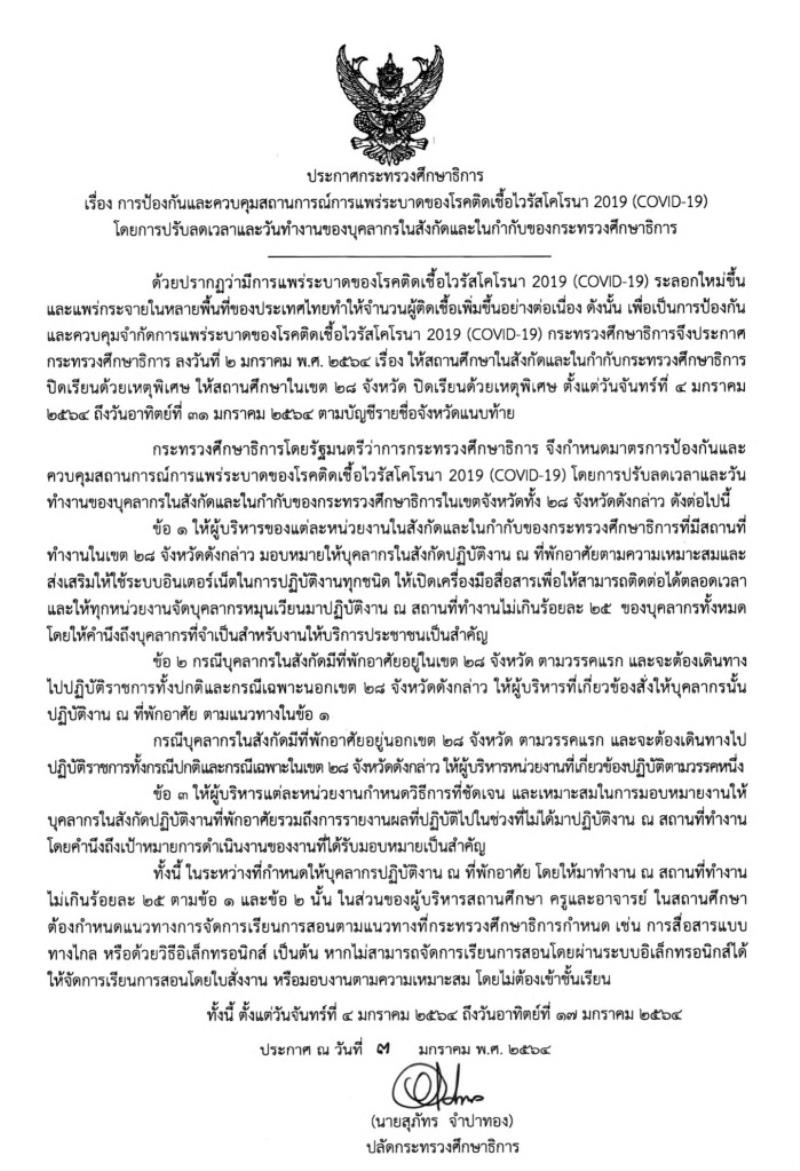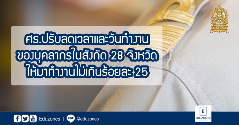 EZ Webmaster January 4, 2021 EZ Webmaster January 4, 2021 ศธ.ปรับลดเวลาและวันทำงานของบุคลากรในสังกัด 28 จังหวัด ให้มาทำงานไม่เกินร้อยละ 25 เมื่อวันที่ 3 มกราคม 2564 ที่ผ่านมา ปลัดกระทรวงศึกษาธิการ นายสุภัทร จำปาทอง ได้ลงนามประกาศกระทรวงศึกษาธิการ เรื่อง การป้องกันและควบคุมสถานการณ์การแพร่ระบาดของโรคติดเชื้อไวรัสโคโรนา 2019 (COVID-19) โดยการปรับลดเวลาและวันทำงานของบุคลากรในสังกัดและในกำกับของกระทรวงศึกษาธิการ โดยมีเนื้อหา ดังนี้ กระทรวงศึกษาธิการโดยรัฐมนตรีว่าการกระทรวงศึกษาธิการกำหนดมาตรการป้องกันและควบคุมสถานการณ์การแพร่ระบาดของโรคติดเชื้อไวรัสโคโรน่า 2019 (Covid-19) โดยการปรับลดเวลาและวันทำงานของบุคลากรในสังกัดและในกำกับของกระทรวงศึกษาธิการในเขตจังหวัดทั้ง 28 จังหวัด ด้วยมาตรการดังนี้ 1.ให้ผู้บริหารของแต่ละหน่วยงานในสังกัดและในกำกับของกระทรวงศึกษาธิการที่มีสถานที่ทำงานในเขต 28 จังหวัด มอบหมายให้บุคลากรในสังกัดปฏิบัติงาน ณ ที่พักตามความเหมาะสมและส่งเสริมให้ใช้ระบบอินเทอร์เน็ตในการปฏิบัติงานทุกชนิด ให้เปิดเครื่องมือสื่อสารเพื่อให้สามารถติดต่อได้ตลอดเวลา และให้ทุกหน่วยงานจัดบุคลากรหมุนเวียนมาปฏิบัติงาน ณ สถานที่ทำงาน ไม่เกินร้อยละ 25 ของบุคลากรทั้งหมด 2.กรณีบุคลากรในสังกัดมีที่พักอยู่ในเขต 28 จังหวัดและจะต้องเดินทางไปปฏิบัติราชการนอกเขต 28 จังหวัดดังกล่าว ให้ผู้บริหารที่เกี่ยวข้องสั่งบุคลากรนั้นปฏิบัติงานที่พัก 3.ให้ผู้บริหารแต่ละหน่วยงานกำหนดวิธีการที่ชัดเจนและเหมาะสมในการมอบหมายงานให้บุคลากรปฏิบัติงาน ณ ที่พักอาศัย รวมถึงการรายงานผลที่ปฏิบัติภายในช่วงที่ไม่ได้มาปฏิบัติงาน ณ สถานที่ทำงาน โดยคำนึงเป้าหมายการดำเนินงานของงานที่ได้รับมอบหมายเป็นสำคัญ ในส่วนของผู้บริหารสถานศึกษา ครู และอาจารย์ในสถานศึกษา ต้องกำหนดแนวทางการจัดการเรียนการสอนตามแนวทางที่กระทรวงศึกษาธิการกำหนด เช่นการสื่อสารแบบทางไกล หรือด้วยวิธีอิเล็กทรอนิกส์ เป็นต้น หากไม่สามารถจัดการเรียนการสอนโดยผ่านระบบอิเล็กทรอนิกส์ได้ให้จัดการเรียนการสอนโดยไปสั่งงานหรือมอบงานตามความเหมาะสม โดยไม่ต้องเข้าชั้นเรียน ขอบคุณข้อมูลจาก -กระทรวงศึกษาธิการ