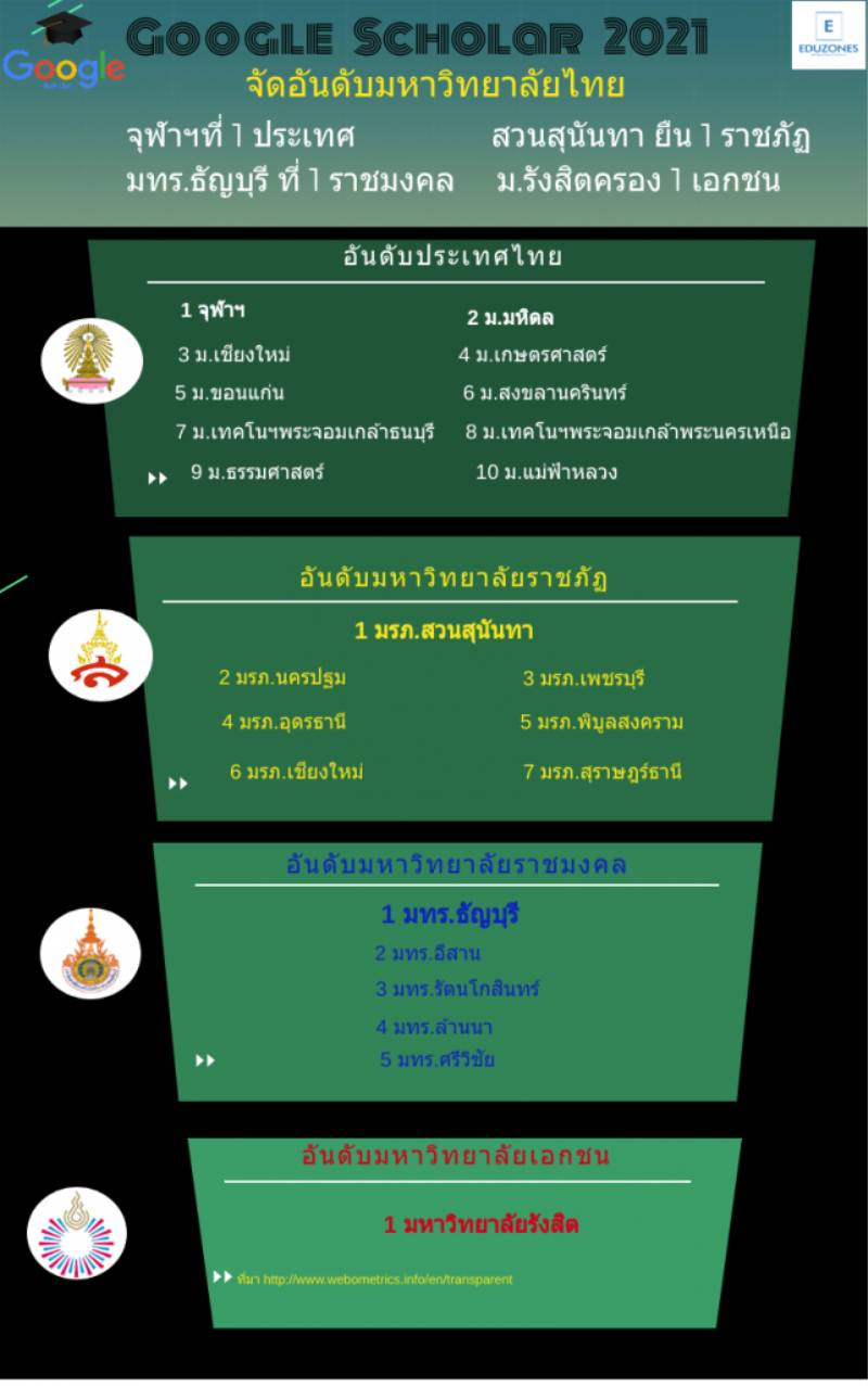 tui sakrapee January 5, 2021 tui sakrapee January 5, 2021 Google Scholar January 2021จัดอันดับ “จุฬาฯ” ที่ 1 ประเทศ “สวนสุนันทา-มทร.ธัญบุรี-ม.รังสิต” ยังยืน 1 ของกลุ่ม Google Scholar January 2021 version 11.1.1 BETA ประกาศผลการจัดอันดับ “จุฬาฯ” ยังอยู่ที่ 1 ประเทศ ‘สวนสุนันทา’ ยืนหยัดผู้นำราชภัฏ ด้าน “มทร.ธัญบุรี” รั้งที่ 1 ราชมงคล ด้าน “ม.รังสิต” มาเดี่ยว ครองเบอร์ 1 มหาวิทยาลัยเอกชน TRANSPARENT RANKING: Top Universities by Citations in Top Google Scholar profiles Eleventh Edition (January 2021 version 11.1.1 beta). ทำการประกาศผลครั้งแรกของปี 2021 ทั้งนี้ข้อมูลนี้อาจจะมีการเปลี่ยนแปลงได้ ซึ่งจะแจ้งให้ทราบกันต่อไป การประกาศผลการจัดอันดับนี้เป็นการแสดงผลในส่วนของมหาวิทยาลัยที่มีการ citations ใน google scholar สูงที่สุด ตรวจสอบได้ที่ http://www.webometrics.info/en/transparent จุฬาฯที่ 1 ของประเทศ โดยมีอันดับ 1-10 ดังนี้ 1 Chulalongkorn University CITATIONS 344895 2 Mahidol University CITATIONS 217142 3 Chiang Mai University CITATIONS 85093 4 Kasetsart University CITATIONS 82920 5 Khon Kaen University CITATIONS 62240 6 Prince of Songkla University CITATIONS 48048 7 King Mongkut’s University of Technology Thonburi CITATIONS 47446 8 King Mongkut’s University of Technology North Bangkok CITATIONS 45595 9 Thammasat University CITATIONS 44123 10 Mae Fah Luang University CITATIONS 28137 สวนสุนันทา อันดับดีขึ้น และครองอันดับ 1 ราชภัฏเช่นเดิม ในกลุ่มมหาวิทยาลัยราชภัฎ “สวนสุนันทา” ยังครองอันดับ 1 ไว้ได้อย่างมั่นคง อยู่ในอันดับที่ 18 ของประเทศ (เดิมอันดับที่19) ส่วนมหาวิทยาลัยราชภัฎอื่น ๆ ที่ติดอันดับมีดังนี้ มหาวิทยาลัยราชภัฎนครปฐม อันดับที่ 24 มหาวิทยาลัยราชภัฎเพชรบุรี อันดับที่ 25 มหาวิทยาลัยราชภัฎอุดรธานี อันดับที่ 28 มหาวิทยาลัยราชภัฎพิบูลสงคราม อันดับที่ 29 มหาวิทยาลัยราชภัฎเชียงใหม่ อันดับที่ 30 มหาวิทยาลัยราชภัฎสุราษฎร์ธานี อันดับที่ 33 มหาวิทยาลัยเทคโนโลยีราชมงคลธัญบุรี ครองที่1กลุ่มราชมงคล โดยมหาวิทยาลัยเทคโนโลยีราชมงคลธัญบุรี ก้าวขึ้นมาอยู่ในอันดับ ที่ 12 ของประเทศ ดีขึ้นกว่าครั้งที่แล้วซึ่งอยู่ที่อันดับ 15 ส่วนมหาวิทยาลัยเทคโนโลยีราชมงคลอีสาน ตามมาเป็นที่ 2 ของกลุ่มนี้ และอยู่อันดับที่ 22 ของประเทศ ด้านมหาวิทยาลัยเทคโนโลยีราชมงคลรัตนโกสินทร์ ที่ 3 ของกลุ่ม ติดอันดับที่ 26 ของประเทศ มหาวิทยาลัยเทคโนโลยีราชมงคลล้านนา ที่ 4 ของกลุ่ม อยู่อันดับที่ 32 โดยมีมหาวิทยาลัยเทคโนโลยีราชมงคลศรีวิชัย ที่ 5 ของกุ่มราชมงคล อยู่อันดับที่ 34 ของประเทศ มหาวิทยาลัยรังสิต มาเดี่ยวครองที่ 1 มหาวิทยาลัยเอกชน ส่วนสถาบันเอกชน “มหาวิทยาลัยรังสิต” ครองอันดับ 1 อยู่ในอันดับ 11 ของประเทศ ดีขึ้นจากเดิมที่อยู่อันดับ 13 ของประเทศโดยกลุ่มนี้มหาวิทยาลัยรังสิตเป็นมหาวิทยาลัยเอกชนเพียงแห่งเดียวที่ติดอันดับในปี 2021 นี้ ที่มาของการจัดอันดับ การจัดอันดับจะพิจารณาจากการ Citation งานวิจัย ที่อยู่ใน Google Scholar ซึ่งหลาย ๆ มหาวิทยาลัยได้ให้ความสำคัญกับการเผยแพร่ผลงานวิจัยในรูป
