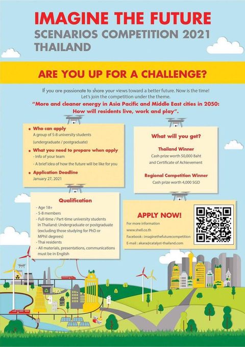 EZ Webmaster January 6, 2021 EZ Webmaster January 6, 2021 สิ้นสุดการรอคอย “Imagine the Future Scenarios Competition Thailand 2021” ขอเชิญนิสิต นักศึกษา สมัครเข้าร่วมเวทีการแข่งขัน สร้างแบบจำลองสถานการณ์อนาคต (Scenario) เพื่อชิงเงินรางวัล 50,000 บาท พร้อมโอกาสในการเป็นทีมตัวแทนประเทศไทย ไปแข่งขันบนเวทีระดับภูมิภาคเอเชีย แปซิฟิค ภายใต้หัวข้อ “More and cleaner energy in Asia Pacific and Middle East cities in 2050: How will residents live, work and play?” . คุณสมบัติผู้สมัคร อายุ 18 ปีขึ้นไป สมาชิกทีม 5-8 คน เป็นนักศึกษาคณะใด หรือสาขาใดก็ได้ มีสัญชาติไทย หรือมีภูมิลำเนาในประเทศไทย การนำเสนอ และการสื่อสาร เป็นภาษาอังกฤษทั้งหมด . เปิดรับสมัครตั้งแต่วันนี้ – 27 มกราคม 2564 . สมัครเข้าร่วมแข่งขันได้ทาง https://bit.ly/itf-apply-form . หรือติดตามข้อมูลข่าวสารได้ที่ https://www.shell.co.th/en_th/energy-and-innovation/imagine-the-future-competition.html?fbclid=IwAR3B97Ya3Uec_iqCofmTpIMCkGXeaUOFg0tl7fECh5CbnyDyXHJFTWVMYyk หรือ Facebook: Imagine the Future Competition
