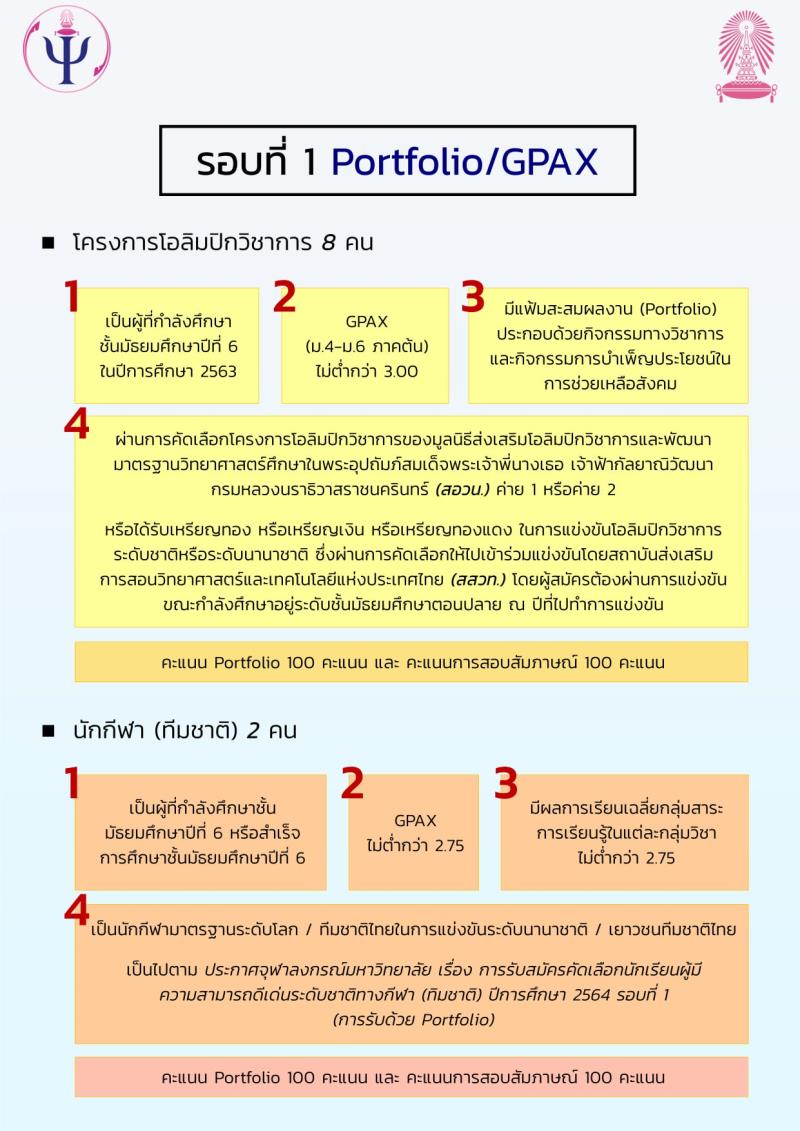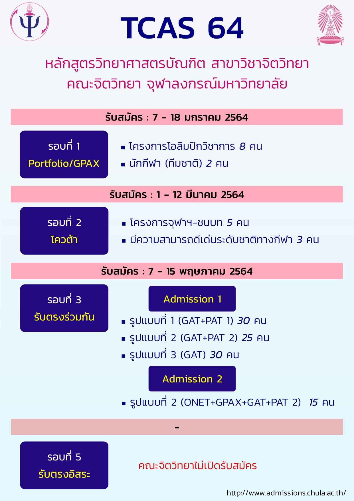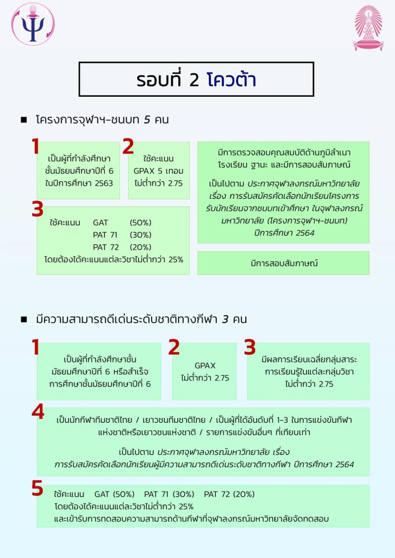 EZ Webmaster January 7, 2021 EZ Webmaster January 7, 2021 กำหนดการและหลักเกณฑ์การรับสมัครเข้าศึกษาระดับปริญญาตรี (ภาคไทย) คณะจิตวิทยา จุฬาลงกรณ์มหาวิทยาลัย ปีการศึกษา 2564 สามารถตรวจสอบรายละเอียดเพิ่มเติมได้ที่ >> http://www.admissions.chula.ac.th