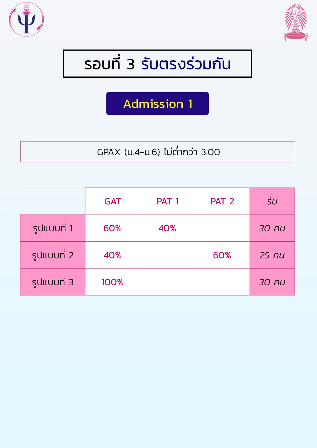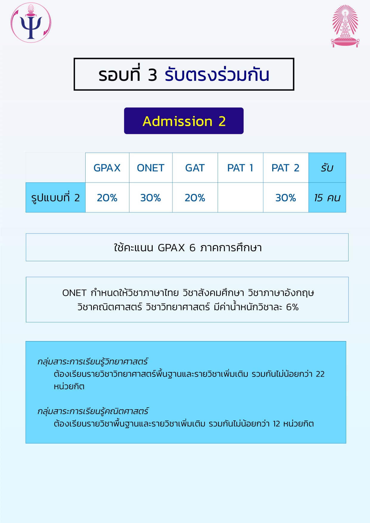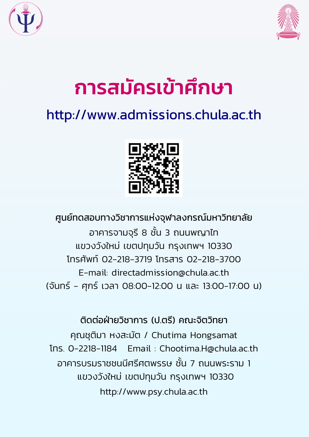 EZ Webmaster January 7, 2021 EZ Webmaster January 7, 2021 กำหนดการและหลักเกณฑ์การรับสมัครเข้าศึกษาระดับปริญญาตรี (ภาคไทย) คณะจิตวิทยา จุฬาลงกรณ์มหาวิทยาลัย ปีการศึกษา 2564 สามารถตรวจสอบรายละเอียดเพิ่มเติมได้ที่ >> http://www.admissions.chula.ac.th