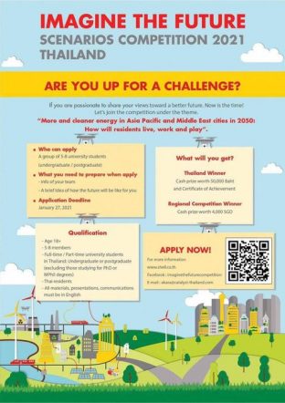 EZ Webmaster January 6, 2021 สิ้นสุดการรอคอย “Imagine the Future Scenarios Competition Thailand 2021” EZ Webmaster January 6, 2021 ขอเชิญนิสิต นักศึกษา สมัครเข้าร่วมเวทีการแข่งขัน สร้างแบบจำลองสถานการณ์อนาคต (Scenario) เพื่อชิงเงินรางวัล 50,000 บาท พร้อมโอกาสในการเป็นทีมตัวแทนประเทศไทย ไปแข่งขันบนเวทีระดับภูมิภาคเอเชีย แปซิฟิค ภายใต้หัวข้อ “More and cleaner energy in Asia Pacific and Middle East cities in 2050: How will residents live, work and play?”… Continue Reading