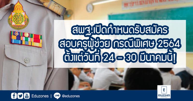 EZ Webmaster February 9, 2021 EZ Webmaster February 9, 2021 สพฐ.เปิดกำหนดรับสมัครสอบครูผู้ช่วย กรณีพิเศษ 2564 ตั้งแต่วันที่ 24 – 30 มีนาคมนี้ เมื่อวันที่ 9 กุมภาพันธ์ 2564 ที่ผ่านมา ทางสำนักงานคณะกรรมการการศึกษาขั้นพื้นฐาน (สพฐ.) ส่งหนังสือถึงศึกษาธิการจังหวัดทุกจังหวัด เรื่องกําหนดการคัดเลือกบุคคลเพื่อบรรจุและแต่งตั้งเข้ารับราชการ เป็นข้าราชการครูและบุคลากรทางการศึกษา ตําแหน่งครูผู้ช่วย กรณีที่มีความจําเป็นหรือมีเหตุพิเศษ สังกัดสํานักงานคณะกรรมการการศึกษาขั้นพื้นฐาน ปี พ.ศ. 2564 โดยมีกำหนดการออกมา ดังนี้ -ประกาศรับสมัคร ภายในวันอังคารที่ 16 มีนาคม 2564 -เปิดรับสมัคร ตั้งแต่วันพุธที่ 24 – วันอังคารที่ 30 มีนาคม 2564 (ไม่เว้นวันหยุดราชการ) -ประกาศรายชื่อผู้มีสิทธิเข้ารับการคัดเลือก ภายในวันศุกร์ที่ 9 เมษายน 2564 -ประเมินประวัติและผลงาน ระหว่างวันศุกร์ที่ 16 – วันศุกร์ที่ 23 เมษายน 2564 -สอบข้อเขียน ภาค ก ความรอบรู้ และความรู้ความเข้าใจเกี่ยวกับ ความประพฤติและการปฏิบัติของวิชาชีพครู ภาค ข ความรู้ความสามารถที่ใช้เฉพาะตําแหน่ง วันเสาร์ที่ 24 เมษายน 2564 -สอบสัมภาษณ์ วันอาทิตย์ที่ 25 เมษายน 2564 -ประกาศผลการคัดเลือก ภายในวันศุกร์ที่ 30 เมษายน 2564 ประกาศกำหนดการรับสมัคร ขอบคุณข้อมูลจาก – https://www.facebook.com/sompanginarn