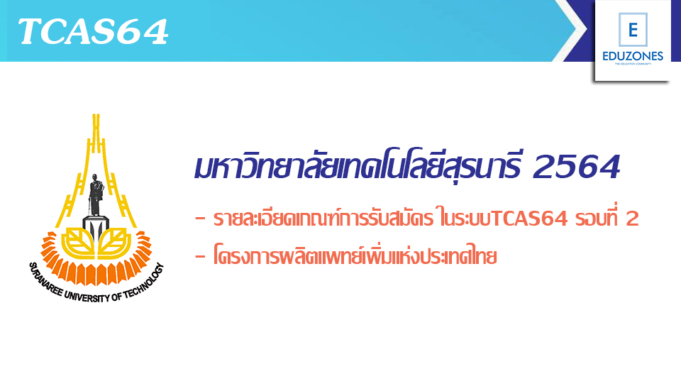 EZ Webmaster March 4, 2021 EZ Webmaster March 4, 2021 #TCAS64 ม.เทคโนโลยีสุรนารี เปิดรับสมัครนศ.ป.ตรี โครงการผลิตแพทย์เพิ่ม ตั้งแต่วันที่ 10-19 มี.ค. 64 มหาวิทยาลัยเทคโนโลยีสุรนารี เปิดรับสมัครบุคคลเพื่อเข้าศึกษาต่อในระดับปริญญาตรี หลักสูตรแพทยศาสตรบัณฑิต โครงการผลิตแพทย์เพิ่มแห่งประเทศไทย รอบที่ 2 โควตาพื้นที่ โดยจะเปิดรับสมัครตั้งแต่วันที่ 10-19 มีนาคม 2564 จำนวนรับ -34 ที่นั่ง กำหนดการ -เปิดรับสมัครตั้งแต่วันที่ 10-19 มีนาคม 2564 -ประกาศรายชื่อผู้มีสิทธิ์สอบสัมภาษณ์ วันที่ 3 พฤษภาคม 2564 -สอบสัมภาษณ์ วันที่ 4 พฤษภาคม 2564 -ประกาศรายชื่อผู้มีสิทธิ์เข้าศึกษา วันที่ 7 พฤษภาคม 2564 -ยืนยันสิทธิ์ในระบบ วันที่ 10 – 11 พฤษภาคม 2564 คุณสมบัติของผู้สมัคร -เป็นผู้ที่สำเร็จการศึกษาในระดับชั้นมัธยมศึกษาตอนปลาย หรือเทียบเท่า -เป็นผู้ที่มีสัญชาติไทย คุณสมบัติกลุ่มแพทย์เพื่อชุมชน -ผู้สมัครจะต้องอยู่ในเขตพื้นที่ นครราชสีมา ชัยภูมิ บุรีรัมย์ และ สุรินทร์ และ ผู้สมัคร บิดา หรือ มารดา ต้องมีภูมิลำเนาอยู่ในจังหวัดต่อเนื่อง ไม่น้อยกว่า 5 ปี นับถึงวันสุดท้ายของการสมัคร -ต้องศึกษาในโรงเรียนที่ตั้งอยู่ในเขตพื้นที่ 20 จังหวัดของภาคตะวันออกเฉียงเหนือ คุณสมบัติกลุ่มลดความเหลื่อมล้ำ -ผู้สมัครจะต้องอยู่ในเขตพื้นที่ นครราชสีมา ชัยภูมิ บุรีรัมย์ และ สุรินทร์ และ ผู้สมัคร บิดา หรือ มารดา ต้องมีภูมิลำเนาอยู่นอกเขตอำเภอเมืองจังหวัดนั้น ๆ ไม่น้อยกว่า 5 ปี นับถึงวันสุดท้ายของการสมัคร -ต้องศึกษาในโรงเรียนที่ตั้งอยู่ในจังหวัดเดียวกันกับภูมิลำเนาที่สมัคร โดยต้องระบุจังหวัดและอำเภอที่มีภูมิลำเนาอยู่นานที่สุด ช่องทางการสมัคร -สมัครทางออนไลน์ผ่านเว็บไซต์ http://sutgateway.sut.ac.th/ เอกสารประกอบการสมัคร (ไฟล์แนบ) -รูปถ่าย ขนาด 600×800 pixels จำนวน 1 รูป -ใบรับรองผลการเรียน -สำเนาทะเบียนบ้านของผู้สมัคร บิดา-มารดา หรือผู้ปกครอง -สำเนาการเปลี่ยนชื่อ-นามสกุล (ถ้ามี) -สำเนาหลักฐานการโยกย้าย (กรณีบิดาหรือมารดาเป็นข้าราชการไม่ครบ 5 ปี) หลักเกณฑ์การพิจารณารับเข้า -คะแนน 9 วิชาสามัญ วิชาคณิตศาสตร์ 1 ฟิกส์ เคมี ชีววิทยา อังกฤษ -การสอบสัมภาษณ์ -การตรวจร่างกาย -คุณสมบัติครบตามที่โครงการกำหนด สำหรับผู้ที่สนใจสมัครเข้าศึกษาสามารถเข้าไปศึกษารายละเอียดเพิ่มเติม ได้ที่ >>> คลิก ขอบคุณข้อมูลจาก -เว็บไซต์มหาวิทยาลัยสุรนารี
