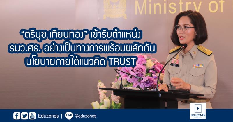 EZ Webmaster March 29, 2021 EZ Webmaster March 29, 2021 “ตรีนุช เทียนทอง” เข้ารับตำแหน่ง รมว.ศธ. อย่างเป็นทางการ พร้อมผลักดันนโยบายภายใต้แนวคิด TRUST เมื่อวันจันทร์ที่ 29 มีนาคม 2564 ที่ผ่านมา นางสาวตรีนุช เทียนทอง ได้เข้ารับตำแหน่งรัฐมนตรีว่าการกระทรวงศึกษาธิการอย่างเป็นทางการ พร้อมมอบนโยบายผู้บริหารกระทรวงศึกษาธิการ โดยมีคุณหญิงกัลยา โสภณพนิช และนางกนกวรรณ วิลาวัลย์ รัฐมนตรีช่วยว่าการกระทรวงศึกษาธิการ พร้อมด้วยนายสุภัทร จำปาทอง ปลัดกระทรวงศึกษาธิการ ผู้บริหารกระทรวงศึกษาธิการ ข้าราชการ และบุคลากรทางการศึกษา ให้การต้อนรับ ณ กระทรวงศึกษาธิการ จากนั้นได้ร่วมประชุมเพื่อมอบนโยบายผู้บริหารองค์กรหลักและหน่วยงานในกำกับของ ศธ. ณ ห้องประชุมราชวัลลภ โดย รมว.ศึกษาธิการ กล่าวว่า วันนี้ถือเป็นการเริ่มต้นการทำงานวันแรกที่กระทรวงศึกษาธิการ (ศธ.) ซึ่งเป็นกระทรวงที่มีโครงสร้างขนาดใหญ่ และมีกรอบภาระงานในหลากหลายมิติ โดยมีความตั้งใจที่จะสานต่อโครงการดี ๆ ที่อดีตรัฐมนตรีว่าการกระทรวงศึกษาธิการ (นายณัฏฐพล ทีปสุวรรณ) ริเริ่มไว้ ให้เกิดผลอย่างเป็นรูปธรรมมากยิ่งขึ้น อาทิ การพัฒนาโรงเรียนคุณภาพของชุมชนและการพัฒนาเด็กปฐมวัย เป็นต้น พร้อมทั้งจะเร่งดำเนินการแก้ปัญหาที่มีความเร่งด่วน โดยเฉพาะอย่างยิ่งเรื่องความปลอดภัยในสถานศึกษา ที่ ศธ. ต้องมีมาตรการดูแลและมีแนวปฏิบัติด้านต่าง ๆ รวมถึงระบบดูแลช่วยเหลือนักเรียน เพื่อสร้างความมั่นใจให้กับผู้ปกครอง ว่าโรงเรียนที่เปรียบเสมือนเป็นบ้านหลังที่สองของนักเรียน เป็นสถานที่ปลอดภัยสำหรับเด็กและเยาวชนทุกคน นอกจากนี้ ได้ให้ความสำคัญเกี่ยวกับการพัฒนาทักษะดิจิทัลและทักษะที่จำเป็นในศตวรรษที่ 21 เนื่องด้วยสถานการณ์การแพร่ระบาดของ COVID-19 ที่ส่งผลให้กระบวนการเรียนรู้เปลี่ยนแปลงไป และปฏิเสธไม่ได้ว่าการจัดการเรียนการสอนในปัจจุบัน ต้องอาศัยการเรียนออนไลน์มากขึ้น จึงต้องมีการพัฒนาดิจิทัลแพลตฟอร์ม และนำเทคโนโลยีเข้ามาปรับใช้กับการเรียนรู้ให้เหมาะสมกับผู้เรียนมากขึ้น โดยต้องมีการพัฒนาโครงสร้างพื้นฐาน (Infrastructure) ที่ทำให้ผู้เรียนสามารถเข้าถึงการเรียนรู้อย่างเท่าเทียม ซึ่งถือเป็นการลดความเหลื่อมล้ำ และเพิ่มโอกาสในการเข้าถึงการศึกษา นำไปสู่การเตรียมความพร้อมให้ผู้เรียนมีทักษะที่จำเป็นในศตวรรษที่ 21 เช่น ทักษะการคิดวิเคราะห์ (Critical Thinking), การปรับตัวในโลกที่เปลี่ยนแปลงไปอย่างรวดเร็ว, การส่งเสริมภาษาต่างประเทศ เป็นต้น ในส่วนของการอาชีวศึกษา จะมุ่งเน้นการขับเคลื่อนภาพลักษณ์ที่ดีและยกระดับศูนย์ความเป็