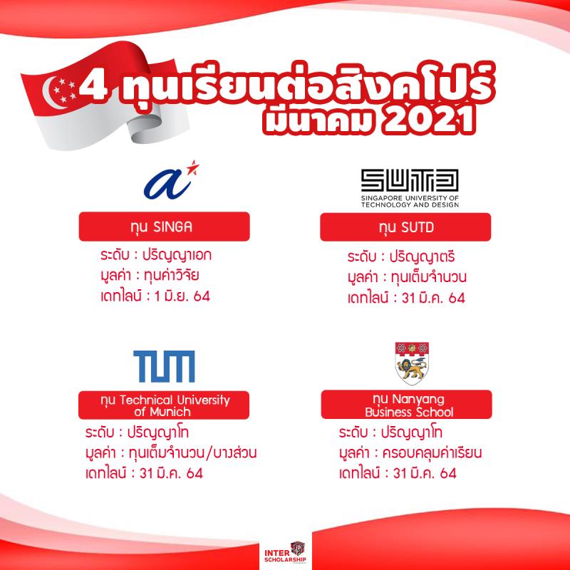 EZ Webmaster March 30, 2021 EZ Webmaster March 30, 2021 4 ทุนเรียนต่อสิงคโปร์ มีนาคม ปี 2021 ประเทศสิงคโปร์ถือเป็นอีกหนึ่งประเทศที่เหมาะสำหรับการไปเรียนต่อ ด้วยมีปัจจัยหลายอย่างที่เอื้อสำหรับนักเรียนนักศึกษาในการไปเรียนต่อทั้งคุณภาพการศึกษา บรรยากาศที่เอื้อต่อการเรียนรู้ภาษาอังกฤษ รวมถึงการมีทุนช่วยเหลือสำหรับการเรียนต่อ วันนี้เราจึงรวมทุนการเรียนต่อที่ประเทศสิงคโปร์ อัพเดตเดือนมีนาคม ปี 2021 มาฝากกันค่ะ 1.ทุน Singapore International Graduate Award Singapore International Graduate Award (or SINGA) เป็นทุนระดับปริญญาเอก ที่เปิดโอกาสให้ผู้ศึกษาวิจัยเข้ามาศึกษาวิจัยที่ประเทศสิงคโปร์ โดยจะเปิดรับใบสมัครถึงวันที่ 1 มิถุนายน 2021 รายละเอียดคลิก >>> http://th.interscholarship.com/somkiat2013/4408 2.ทุน Singapore University of Technology and Design (SUTD) Singapore University of Technology and Design กำลังเปิดรับสตรีจากต่างชาติที่มีผลการเรียนดี ชิงทุน Kewalram Chanrai Group SUTD Scholarships ประจำปี 2021-2022 ซึ่งเป็นทุนเต็มจำนวนในระดับปริญญาตรี โดยจะเปิดรับใบสมัครถึงวันที่ 31 มีนาคม 2021 รายละเอียดคลิก >>> http://th.interscholarship.com/somkiat2013/4445 3.ทุน Technical University of Munich Technical University of Munich กำลังเปิดให้ทุนเต็มจำนวนและบางส่วน สำหรับศึกษาต่อระดับปริญญาโท ด้าน Information on Industry โดยจะเปิดรับใบสมัครถึง 31 มีนาคม 2021 รายละเอียดคลิก >>> http://th.interscholarship.com/somkiat2013/4437 4.ทุน Nanyang Business School ทุน NTU-MBA funding for International Students in Singapore ประจำปีการศึกษา 2021-2022 ของ มหาวิทยาลัยเทคโนโลยีนานยาง กำลังเปิดให้แก่นักศึกษาทุกสัญชาติ ซึ่งเป็นทุนครอบคลุมค่าเรียนทั้งหมด ในระดับปริญญาโท เป็นระยะเวลา 3 เทอม (12 เดือน) โดยจะเปิดรับใบสมัครถึง 31 มีนาคม 2021 รายละเอียดคลิก >>> http://th.interscholarship.com/somkiat2013/4412 สำหรับผู้ที่สนใจสมัครเรียนต่อต่างประเทศในระดับปริญญาตรี ก็สามารถเข้าไปดูทุนเรียนต่อปริญญาตรี อัพเดตเดือนมีนาคม 2021 ได้ที่ >>> คลิก