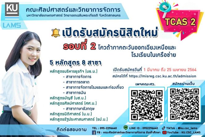 EZ Webmaster March 13, 2021 มหาวิทยาลัยเกษตรศาสตร์ วิทยาเขตเฉลิมพระเกียรติ จังหวัดสกลนคร เปิดรับสมัครนิสิตใหม่ รอบที่ 2 โควตาภาคตะวันออกเฉียงเหนือและโรงเรียนเครือข่าย EZ Webmaster March 13, 2021 มหาวิทยาลัยเกษตรศาสตร์ วิทยาเขตเฉลิมพระเกียรติ จังหวัดสกลนครเปิดรับสมัครนิสิตใหม่ ในระดับปริญญาตรี TCAS 64 รอบที่ 2 คณะศิลปศาสตร์และวิทยาการจัดการ มหาวิทยาลัยเกษตรศาสตร์ วิทยาเขตเฉลิมพระเกียรติ จังหวัดสกลนคร โควตาภาคตะวันออกเฉียงเหนือและโรงเรียนเครือข่าย เปิดรับสมัคร ตั้งแต่วันที่ 1 มีนาคม ถึง 25 เมษายน 2564 เปิดรับสมัคร 8 สาขา 1) สาขาวิชาการเงิน (บธ.บ.) 2) สาขาวิชาการจัดการโรงแรมและท่องเที่ยว (บธ.บ.) 3) สาขาวิชาการบัญชี … Continue Reading