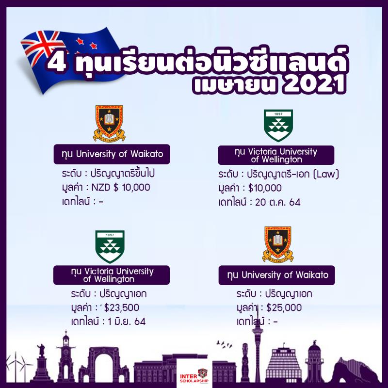 EZ Webmaster April 11, 2021 Blog 4 ทุนเรียนต่อนิวซีแลนด์ เมษายน ปี 2021 EZ Webmaster April 11, 2021 4 ทุนเรียนต่อนิวซีแลนด์ เมษายน ปี 2021 ประเทศนิวซีแลนด์ถือเป็นประเทศที่มีระบบการศึกษาที่มีคุณภาพอีกประเทศหนึ่ง เป็นประเทศที่มีนวัตกรรมด้านการวิจัยทางการศึกษาและการพัฒนาด้านการศึกษาดีระบบต้นๆ ของโลก จึงทำให้เป็นนิวซีแลนด์เป็นอีกหนึ่งประเทศที่น่าไปศึกษาต่อ วันนี้เราจึงมี 4 ทุนเรียนต่อประเทศนิวซีแลนด์ อัพเดตเดือนเมษายน ปี 2021 มาฝากกันค่ะ 1.ทุน Victoria University of Wellington Victoria University of Wellington เปิดให้ทุนระดับปริญญาเอก (ในจำนวนจำกัด) แก่ทั้งนักศึกษาท้องถิ่นและนานาชาติ โดยพิจารณาจากความเป็นเลิศของผลการศึกษาที่ผ่านมา ทุนนี้มีมูลค่าเป็นเงินช่วยเหลือปีละ $23,500 เป็นเวลาตลอดการทำวิจัย ระยะเวลา 3 ปี โดยจะเปิดรับสมัครวันที่ 1 มีนาคม, 1 มิถุนายน และ 1 พฤศจิกายน 2021 รายละเอียดเพิ่มเติมคลิก >>> http://th.interscholarship.com/somkiat2013/4457 2.ทุน Victoria University of Wellington Victoria University of Wellington กำลังเปิดรับใบสมัครชิงทุนมูลค่า $10,000 แก่ผู้สมัครเรียนจากนานาชาติ ที่ต้องการมาศึกษาระดับปริญญาตรี โท และเอกที่มหาวิทยาลัยในสาขาเกี่ยวกับ Constitutional law, Human rights, International law โดยทุนนี้จะเปิดรับสมัครถึงวันที่ 30 ตุลาคม 2021 รายละเอียดเพิ่มเติมคลิก >>> http://th.interscholarship.com/somkiat2013/4463 3.ทุน University of Waikato ทุน International Excellence Scholarships มหาวิทยาลัย Waikato เปิดให้ทุนในระดับปริญญาตรี หรือสูงกว่า รวมไปถึงโปรแกรมวิจัย มูลค่า NZD $ 10,000 สำหรับผู้ที่มีผลการเรียนยอดเยี่ยมและมีคุณสมบัติที่สามารถเป็นทูตสันถวไมตรีของมหาวิทยาลัยได้ รายละเอียดเพิ่มเติมคลิก >>> http://th.interscholarship.com/somkiat2013/4465 4.ทุน University of Waikato University of Waikato เปิดรับสมัครผู้มีที่อยู่ถาวรในนิวซีแลนด์ รวมทั้งจากนานาชาติ สมัครโปรแกรม Doctoral scholarships ชิงทุนในระดับปริญญาเอก (ไม่จำกัดสาขาวิชา) มูลค่า $25,000 รายละเอียดเพิ่มเติมคลิก >>> http://th.interscholarship.com/somkiat2013/4438 สำหรับผู้ที่สนใจอยากศึกษาข้อมูลหรืออัพเดตทุนสำหรับการเรียนต่อต่างประเทศเพิ่มเติม ก็สามารถเข้าไปดูเพิ่มเติม ได้ที่ >>> https://www.eduzones.com/