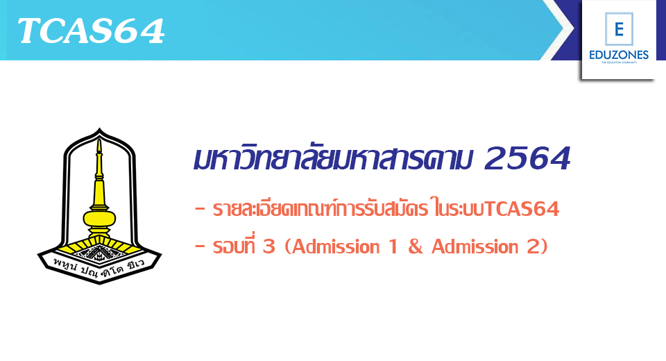 EZ Webmaster April 19, 2021 EZ Webmaster April 19, 2021 #TCAS64 ม.มหาสารคาม เปิดรับสมัครนศ.ปตรี รอบที่ 3 (Admission 1-2) ตั้งแต่วันที่ 7-15 พ.ค. 64 มหาวิทยาลัยมหาสารคาม เปิดรับสมัครคัดเลือกบุคคลเพื่อเข้าศึกษาต่อในระดับปริญญาตรี รอบที่ 3 (Admission 1 & Admission 2) ประจำปีการศึกษา 2564 โดยจะเปิดรับสมัครตั้งแต่วันที่ 7-15 พฤษภาคม 2564 คณะ/สาขาที่เปิดรับ -Admission 1 : 957 ที่นั่ง -Admission 2 : 487 ที่นั่ง คณะที่เปิดรับสมัคร Admission 1 -คณะแพทยศาสตร์ -คณะเภสัชศาสตร์ -คณะสาธารณสุขศาสตร์ -คณะวิทยาศาสตร์ -คณะเทคโนโลยี -คณะสัตวแพทยศาสตร์ -คณะสิ่งแวดล้อมและทรัพยากรศาสตร์ -คณะวิทยาการสารสนเทศ -คณะวิศวกรรมศาสตร์ -คณะสถาปัตยกรรมศาสตร์ ผังเมืองและนฤมิตศิลป์ -คณะการบัญชีและการจัดการ -คณะการท่องเที่ยวและการโรงแรม -คณะมนุษยศาสตร์และสังคมศาสตร์ -วิทยาลัยการเมืองการปกครอง -คณะศึกษาศาสตร์ -คณะศิลปกรรมศาสตร์และวัฒนธรรมศาสตร์ -วิทยาลัยดุริยางคศิลป์ -คณะนิติศาสตร์ Admission 2 -คณะแพทยศาสตร์ -คณะเภสัชศาสตร์ -คณะสาธารณสุขศาสตร์ -คณะวิทยาศาสตร์ -คณะเทคโนโลยี -คณะสัตวแพทยศาสตร์ -คณะสิ่งแวดล้อมและทรัพยากรศาสตร์ -คณะวิทยาการสารสนเทศ -คณะวิศวกรรมศาสตร์ -คณะสถาปัตยกรรมศาสตร์ ผังเมืองและนฤมิตศิลป์ -คณะการบัญชีและการจัดการ -คณะการท่องเที่ยวและการโรงแรม -คณะมนุษยศาสตร์และสังคมศาสตร์ -วิทยาลัยการเมืองการปกครอง -คณะศึกษาศาสตร์ -คณะศิลปกรรมศาสตร์และวัฒนธรรมศาสตร์ -วิทยาลัยดุริยางคศิลป์ -คณะนิติศาสตร์ กำหนดการ -เปิดรับสมัครตั้งแต่ วันที่ 7-15 พฤษภาคม 2564 -ประกาศผลครั้งที่ 1 วันที่ 26 พฤษภาคม 2564 -ยืนยันสิทธิ์ครั้งที่ 1 วันที่ 26 – 27 พฤษภาคม 2564 (ยืนยันสิทธิ์ หรือ ไม่ใช้สิทธิ์ หรือ ขอประมวลผลครั้งที่ 2) -ประกาศผลครั้งที่ 2 วันที่ 1 มิถุนายน 2564 -ยืนยันสิทธิ์ครั้งที่ 2 อัตโนมัติ คุณสมบัติของผู้สมัคร -เป็นผู้ที่สำเร็จการศึกษาในระดับชั้นมัธยมศึกษาปีที่ 6 หรือเทียบเท่า -เป็นผู้ที่มีคุณสมบัติเพิ่มเติมตามที่แต่ละคณะ/สาขาวิชากำหนด ช่องทางการสมัคร -สมัครทางออนไลน์ผ่านเว็บไซต์ https://student.mytcas.com/ -ผู้สมัครสามารถเลือกสมัครได้ 2 รูปแบบคละกันได้ หรือ เลือกรูปแบบใดรูปแบบหนึ่งก็ได้ หรือจะคณะเดียวกัน สาขาเดียวกัน เลือกทั้ง 2 รูปแบบก็ได้ หลักเกณฑ์การพิจารณารับเข้า Admission 1 -ผลคะแนน GAT/PAT ปี 2563 หรือ 2564 ตามที่แต่ละคณะ/สาขาวิชากำหนด รายละเอียด >>>คลิก Admission 2 -เกรดเฉลี่ยสะสม (GPAX) 20 % -ผลคะแนน O-NET 30 % (วิชาภาษาไทย สังคม อังกฤษ คณิตศาสตร์ วิทยาศาสตร์) -ผลคะแนน GAT/PAT รายละเอียด >>> คลิก สำหรับผู้ที่สนใจสมัครสามารถเข้าไปศึกษารายละเอียดเพิ่มเติม ได้ที่ >>> คลิก ขอบคุณข้อมูลจาก -เว็บไซต์มหาวิทยาลัยมหาสารคาม