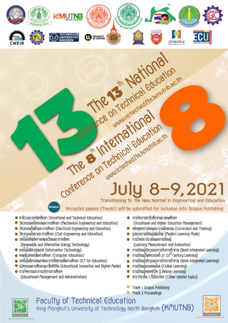 EZ Webmaster April 20, 2021 EZ Webmaster April 20, 2021 คณะครุฯ มจพ. ขยายเวลาส่งบทความวิจัยการประชุมวิชาการครุศาสตร์อุตสาหกรรมระดับชาติ ครั้งที่ 13 และการจัดประชุมวิชาการครุศาสตร์อุตสาหกรรม ระดับนานาชาติ ครั้งที่ 8 คณะครุศาสตร์อุตสาหกรรม มหาวิทยาลัยเทคโนโลยีพระจอมเกล้าพระนครเหนือ (มจพ.) กำหนดจัดประชุมวิชาการครุศาสตร์อุตสาหกรรมระดับชาติ ครั้งที่ 13 The 13th National Conference on Technical Education (NCTechEd13) และการประชุมวิชาการครุศาสตร์อุตสาหกรรมระดับนานาชาติ ครั้งที่ 8 The 8th International Conference on Technical Education (ICTechEd8) หัวข้อเรื่อง “Transitioning to the New Normal in Engineering and Education” ระหว่างวันที่ 8-9 กรกฎาคม 2564 นั้น ในรูปแบบ onsite (หรือ online เนื่องจากสถานการณ์การแพร่ระบาดของโรคติดเชื้อไวรัสโคโรนา 2019 (COVID-19) รอบใหม่ในประเทศไทย) โดยจัดการประชุมสัมมนาภาพรวมและการประชุมกลุ่มย่อยในด้านครุศาสตร์อุตสาหกรรม วิศวกรรมศาสตร์ วิทยาศาสตร์และเทคโนโลยีสารสนเทศ เทคโนโลยีทางการศึกษา วิจัยและพัฒนาหลักสูตร และการบริหารธุรกิจ เพื่อเผยแพร่ผลงานวิจัยทางด้านครุศาสตร์อุตสาหกรรมที่เกี่ยวข้องในสาขาวิชาต่าง ๆ การระดมความคิดเห็นและประสบการณ์ และสร้างเครือข่ายความรู้ด้านครุศาสตร์อุตสาหกรรมให้กับคณาจารย์ บุคลากรทางการศึกษาและผู้สนใจทั่วไปจากทั่วประเทศ คณะครุศาสตร์อุตสาหกรรม มจพ. ได้ขยายเวลาการส่งผลงานวิจัยฉบับเต็มจากเดิมกำหนดส่งวันสุดท้ายวันที่ 29 มีนาคม 2564 เป็นวันที่ 10 พฤษภาคม 2564 การจัดประชุมวิชาการครุศาสตร์อุตสาหกรรมระดับชาติ ครั้งที่ 13 ดำเนินการตามหลักการรักษาระยะห่างทางกายภาพ ตามมาตรการป้องกันและควบคุมโรคของกระทรวงสาธารณสุข ทางคณะผู้จัดงานประชุมวิชาการฯ ขอสงวนสิทธิ์ปรับเปลี่ยนการนำเสนอผลงานเป็นรูปแบบออนไลน์ หรือให้เป็นไปตามประกาศของศูนย์บริหารสถานการณ์แพร่ระบาดของโรคติดเชื้อไวรัสโคโรนา 2019 หรือประกาศมหาวิทยาลัยต่อไป รายละเอียดดดังนี้ 1) วันสุดท้ายของการรับผลงานวิจัยฉบับเต็ม (Submission of Full paper) วันที่ 10 พฤษภาคม 2564 2) แจ้งผลการพิจารณาผลงานวิจัยฉบับเต็ม (Notification of Acceptance) วันที่ 31 พฤษภาคม 2564 3) ส่งผลงานวิจัยฉบับสมบูรณ์ (Submission of Final Manuscript) วันที่ 14 มิถุนายน 2564 พร้อมชำระเงินค่าลงทะเบียน ขอเชิญคณาจารย์ บุคลากร นักศึกษา และผู้สนใจทั่วไป เข้าร่วมประชุมวิชาการ และส่งบทความวิจัยในกลุ่มสาขาวิชาดังกล่าวข้างต้น โดยสามารถติดตามรายละเอียดเพิ่มเติม รวมถึง Download แบบฟอร์มทางเว็บไซต์ http://ncteched.fte.kmutnb.ac.th หรือ E-mail : ncteched@fte.kmutnb.ac.th และการประชุมวิชาการครุศาสตร์อุตสาหกรรมระดับนานาชาติ ครั้งที่ 8 ทางเว็บไซต์ http://icteched.fte.kmutnb.ac.th หรือ E-mail : icteched@fte.kmutnb.ac.th โดยผลงานวิจัยที่ได้รับการตอบรับจะได้รับการพิจารณาลงตีพิมพ์ ใ
