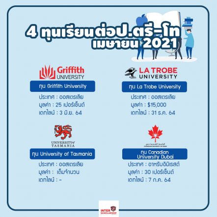 EZ Webmaster April 18, 2021 อัพเดท 4 ทุนเรียนต่อป.ตรี-โท เมษายน 2021 EZ Webmaster April 18, 2021 สำหรับน้องๆ มัธยมศึกษาที่สนใจไปศึกษาต่อระดับปริญญาตรี รวมถึงน้องๆ ที่กำลังศึกษาในระดับปริญญาตรีแล้วสนใจไปศึกษาต่อในระดับปริญญาโทที่ต่างประเทศ วันนี้เรามี 4 ทุนการศึกษาสำหรับการศึกษาต่อในระดับปริญญาตรีและปริญญาโท อัพเดทเดือนเมษายน ปี 2021 มาฝากกันค่ะ 1.ทุน Griffith University ทุน International Student Excellence Scholarships ของมหาวิทยาลัย Griffith ประเทศออสเตรเลีย เป็นทุนในระดับปริญญาตรีและโท ประจำปี 2021 ในสาขาต่างๆ ทุนนี้มีมูลค่า 25 เปอร์เซ็นต์ โดยจะเปิดรับสมัครถึงวันที่ 3… Continue Reading