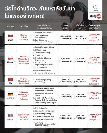 EZ Webmaster April 8, 2021 ใครว่าเรียนต่อนอกต้องใช้งบเยอะ ต่อโทอินเตอร์ในมหาลัยชั้นนำของโลกสาขาวิศวะในงบที่มี EZ Webmaster April 8, 2021 ใครว่าเรียนต่อนอกต้องใช้งบเยอะ⭕️ ต่อโทอินเตอร์ในมหาลัยชั้นนำของโลกสาขาวิศวะในงบที่มี ปรึกษาและวางแผนการเรียนฟรีกับ Studywiz Line : @studywiz T : 0819349695 W : www.studywiz.net จุดเด่นของแต่ละมหาลัย ⭕️ Siberian federal University เป็นม.ระดับท้อปของรัสเซีย รัฐสนับสนุนค่าใช้จ่ายทั้งค่าเล่าเรียนและที่พัก ทำให้ค่าใช้จ่ายต่ำมาก ปลอดภัย มีชื่อเสียงหลากหลายสาขา มีทั้งภาครัสเซียและภาคอินเตอร์ ⭕️ Wroclaw University of Science and Technology หนึ่งในม.เทคโนโลยีที่ใหญ่และมีชื่อเสียงที่สุดในโปแลนด์และยุโรป สามารถทำงานได้ทั้งระหว่างเรียนและหลังจบ สามารถไปแลกเปลี่ยนที่ม.ในโซนยุโรปได้ จบแล้วหางานในยุโรปได้… Continue Reading