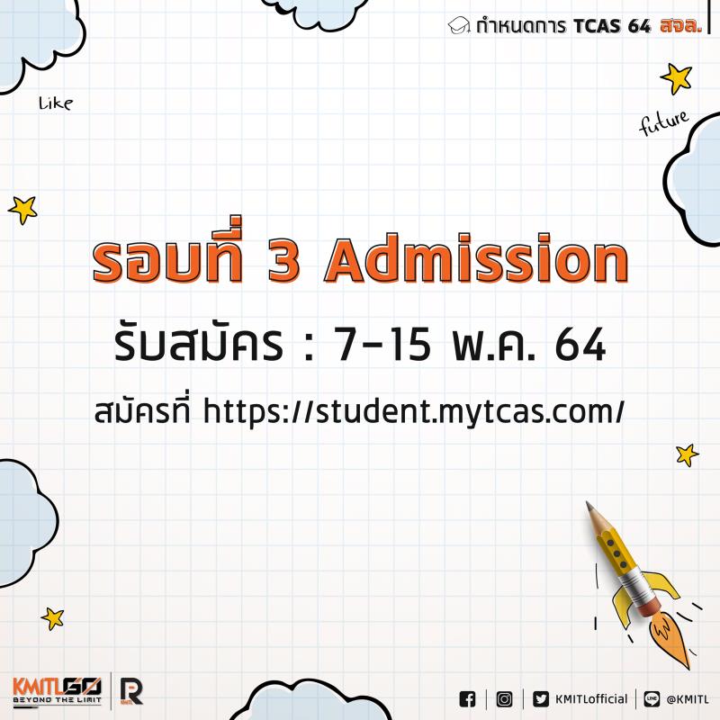 EZ Webmaster May 6, 2021 EZ Webmaster May 6, 2021 สจล. เปิดรับ TCAS64 รอบแอดมิชชัน สถาบันเทคโนโลยีพระจอมเกล้าเจ้าคุณทหารลาดกระบัง (สจล.) เปิดรับสมัคร นักเรียนชั้นมัธยมศึกษาปีที่ 6 หรือเทียบเท่า เข้าศึกษาต่อในหลักสูตรระดับปริญญาตรี ในรอบการรับสมัครสอบ TCAS64 รอบที่ 3 แอดมิชชัน (Admission) ประจำปีการศึกษา 2564 โดยเปิดรับสมัครใน 88 หลักสูตร ครอบคลุม 13 คณะ/วิทยาลัย อาทิ คณะวิศวกรรมศาสตร์ คณะวิทยาศาสตร์ คณะเทคโนโลยีการเกษตร วิทยาลัยอุตสาหกรรมการบินนานาชาติ วิทยาลัยวิศวกรรมสังคีต ฯลฯ ผู้สนใจสามารถตรวจสอบคุณสมบัติและสมัครได้ที่ https://www.reg.kmitl.ac.th ระหว่างวันที่ 7 – 15 พฤษภาคม 2564 สอบถามข้อมูลติดต่อ สำนักทะเบียนและประมวลผล สจล. โทร. 0 2329 8203 กด 4 หรือ www.facebook.com/Admission.KMITL
