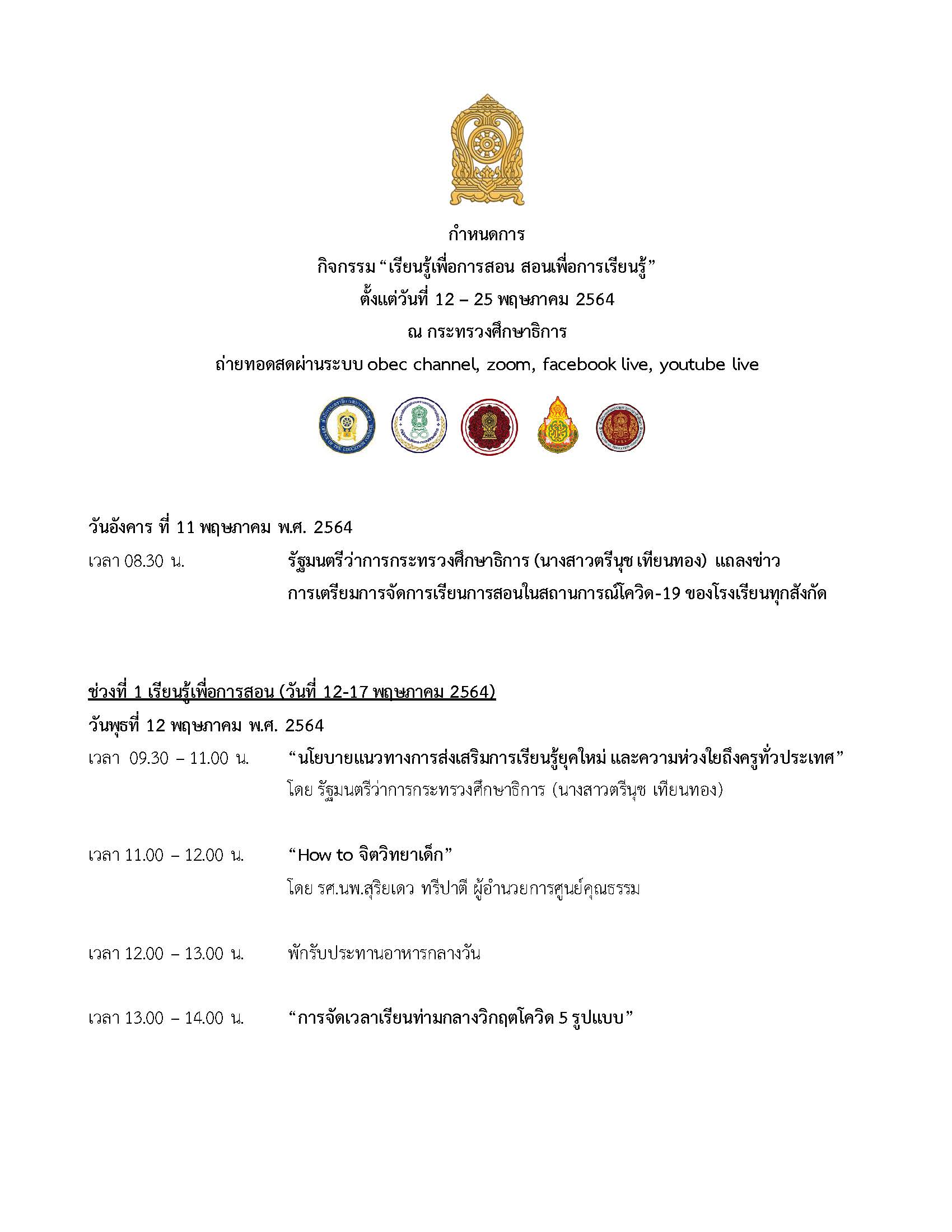 EZ Webmaster May 11, 2021 EZ Webmaster May 11, 2021 เช็กกำหนดการกิจกรรม ”การเรียนรู้เพื่อการสอน สอนเพื่อการเรียนรู้ ” 12-25 พฤษภาคม 2564 จาก สพฐ. สํานักงานคณะกรรมการการศึกษาขั้นพื้นฐาน (สพฐ.) ร่วมกับสํานักงานคณะกรรมการส่งเสริม การศึกษาเอกชน และเครือข่ายความร่วมมือเพื่อส่งเสริมการจัดการศึกษาโรงเรียนเอกชน กําหนดจัดกิจกรรม “เรียนรู้เพื่อการสอน สอนเพื่อการเรียนรู้” ระหว่างวันที่ 12-25 พฤษภาคม 2564 เพื่อเป็นประโยชน์แก่ผู้บริหาร ครู นักเรียน และผู้ที่เกี่ยวข้อง ได้รับความรู้ที่เป็นประโยชน์ต่อการเรียนการสอน โดยสำหรับผู้ที่สนใจรับชมกิจกรรมเรียนรู้เพื่อการสอน สอนเพื่อการเรียนรู้ นี้ สามารถรับชมได้ผ่านช่องทาง OBEC Channel ดังนี้ -OBEC Channel : www.obectv.tv -Facebook : OBEC Channel -YouTube : OBEC TV และสำหรับกำหนดการ กิจกรรม “เรียนรู้เพื่อกำรสอน สอนเพื่อกำรเรียนรู้ ในระหว่างวันที่ 12-25 พฤษภาคม 2564 มีดังนี้ ขอบคุณข้อมูลจาก -สํานักงานคณะกรรมการการศึกษาขั้นพื้นฐาน