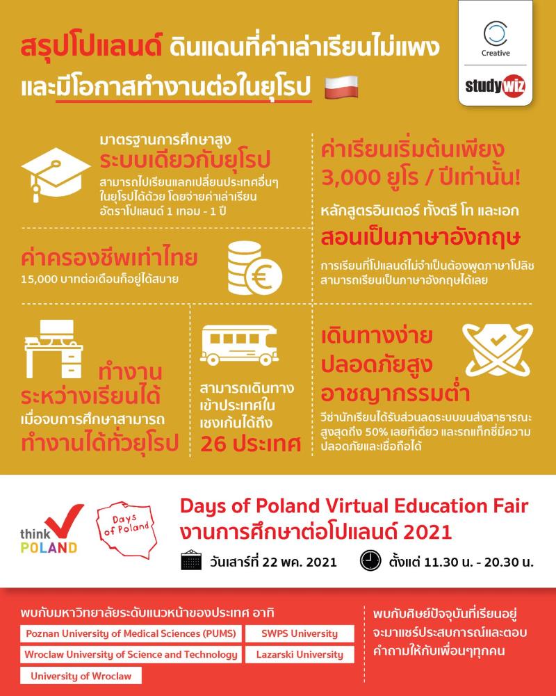 ผู้ที่สนใจเรียนต่อโปแลนด์ห้ามพลาด งานการศึกษาต่อโปแลนด์ Days of Poland Virtual Education Fair วันที่ 22 พค.2021 เริ่ม 11.30 น. เป็นต้นไป