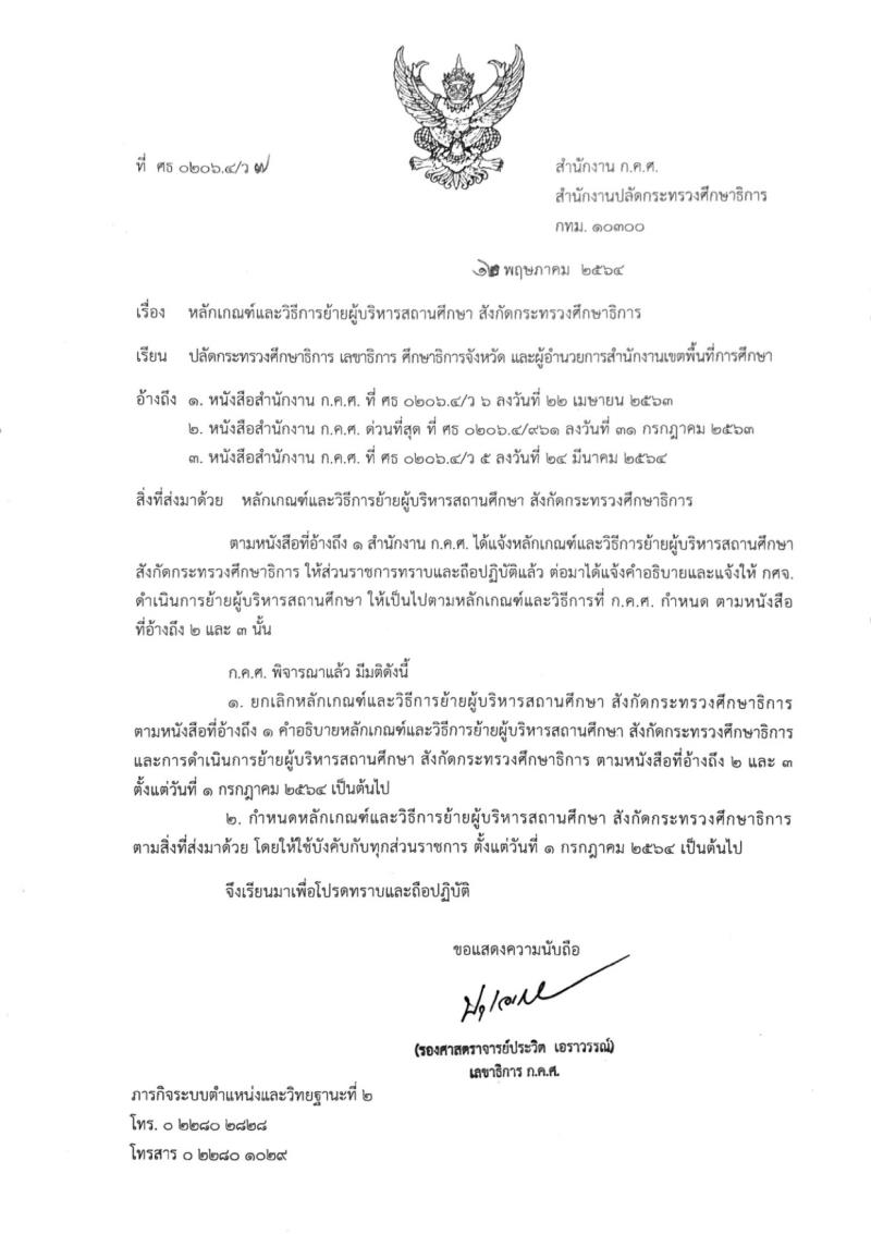 EZ Webmaster May 14, 2021 EZ Webmaster May 14, 2021 เช็ก! หลักเกณฑ์และวิธีการย้ายผู้บริหารสถานศึกษา สังกัดกระทรวงศึกษาธิการ เริ่มใช้ 1 ก.ค. 64 เป็นต้นไป ล่าสุด เมื่อวันที่ 12 พฤษภาคม 2564 ที่ผ่านมา ทางสำนักงานปลัดกระทรวงศึกษาธิการ ได้ส่งหนังสือถึงปลัดกระทรวงศึกษาธิการ เลขาธิการ ศึกษาธิการจังหวัด และผู้อำนวยการสำนักงานเขตพื้นที่การศึกษา เรื่อง หลักเกณฑ์และวิธีการย้ายผู้บริหารสถานศึกษา สังกัดกระทรวงศึกษาธิการ โดย ก.ค.ศ. มีมติ พิจารณาแล้ว ดังนี้ 1.ยกเลิกหลักเกณฑ์และวิธีการย้ายผู้บริหารสถานศึกษา สังกัดกระทรวงศึกษาธิการ ตามหนังสือที่อ้างถึง 1 คำอธิบายหลักเกณฑ์และวิธีการย้ายผู้บริหารสถานศึกษา สังกัดกระทรวงศึกษาธิการ และการดำเนินการย้ายผู้บริหารสถานศึกษา สังกัดกระทรวงศึกษาธิการ ตามหนังสือที่อ้างถึง 2 และ 3 ตั้งแต่วันที่ 1 กรกฎาคม 2564 เป็นต้นไป 2.กำหนดหลักเกณฑ์และวิธีการย้ายผู้บริหารสถานศึกษา สังกัดกระทรวงศึกษาธิการ ตามสิ่งที่ส่งมาด้วย โดยให้ใช้บังคับกับทุกส่วนราชการ ตั้งแต่วันที่ 1 กรกฎาคม 2564 เป็นต้นไป รายละเอียดเอกสารเพิ่มเติม >>> คลิก ขอบคุณข้อมูลจาก -สำนักงานปลัดกระทรวงศึกษาธิการ