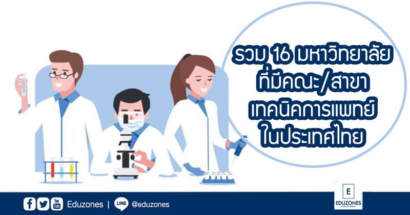 EZ Webmaster May 20, 2021 EZ Webmaster May 20, 2021 รวม 16 มหาวิทยาลัยที่มีคณะ/สาขาเทคนิคการแพทย์ ในประเทศไทย เทคนิคการแพทย์ (Medical technologist) เป็นหนึ่งสาขาวิชาชีพที่มีความสำคัญเป็นอย่างมากอีกวิชาชีพหนึ่งในวงการแพทย์และวิทยาศาสตร์ เนื่องจากเป็นงานที่คอยสนับสนุนอยู่เบื้องหลังการรักษาของแพทย์ โดยมีหน้าที่ในการตรวจ ทดสอบ วิเคราะห์ วิจัย การรายงานผลการตรวจ เพื่อวินิจฉัย การติดตามการรักษา การพยากรณ์โรค และการป้องกันโรคการตรวจภูมิคุ้มกันต่างๆ ในร่างกาย รวมไปถึงการตรวจแยกชนิดและการทดสอบยาปฎิชีวนะ เป็นต้น โดยสำหรับผู้ที่สนใจอยากศึกษาต่อในคณะหรือสาขาที่เกี่ยวกับเทคนิคการแพทย์ วันนี้เราได้รวบรวมคณะ/สาขาเทคนิคการแพทย์ในระดับปริญญาตรีของมหาวิทยาลัยในประเทศไทย ทั้งสิ้น 16 มหาวิทยาลัยมาฝากกันค่ะ 1.จุฬาลงกรณ์มหาวิทยาลัย คณะสหเวชศาสตร์ รายละเอียดเพิ่มเติมคลิก >>> https://www.chula.ac.th/academic/faculty-of-allied-health-sciences/ 2.มหาวิทยาลัยธรรมศาสตร์ คณะสหเวชศาสตร์ -หลักสูตรวิทยาศาสตรบัณฑิต สาขาวิชาเทคนิคการแพทย์ รายละเอียดเพิ่มเติมคลิก >>> https://allied.tu.ac.th/medical-technology/ 3.มหาวิทยาลัยเชียงใหม่ คณะเทคนิคการแพทย์ -สาขาวิชากายภาพบำบัด -สาขาวิชากิจกรรมบำบัด -สาขาวิชารังสีเทคนิค -สาขาวิชาเทคนิคการแพทย์ รายละเอียดเพิ่มเติมคลิก >>> http://www.ams.cmu.ac.th/main/web/ 4.มหาวิทยาลัยขอนแก่น คณะเทคนิคการแพทย์ -หลักสูตรวิทยาศาสตรบัณฑิต สาขาเทคนิคการแพทย์ (ปกติ) -หลักสูตรวิทยาศาตรบัณฑิต สาขาเทคนิคการแพทย์ (โครงการพิเศษ) รายละเอียดเพิ่มเติมคลิก >>> https://amsservice.kku.ac.th/amsthai/index.php/th/ 5.มหาวิทยาลัยนเรศวร คณะสหเวชศาสตร์ -สาขาวิชาเทคนิคการแพทย์ รายละเอียดเพิ่มเติมคลิก >>> http://www.ahs.nu.ac.th/th/ 6.มหาวิทยาลัยสงขลานครินทร์ คณะเทคนิคการแพทย์ -หลักสูตรวิทยาศาสตรบัณฑิต สาขาวิชาเทคนิคการแพทย์ รายละเอียดเพิ่มเติมคลิก >>> https://medtech.psu.ac.th/ 7.มหาวิทยาลัยมหิดล คณะเทคนิคการแพทย์ -ภาควิชาเคมีคลินิก -ภาควิชาจุลชีววิทยาคลินิกและเทคโนโลยีประยุกต์ -ภาควิชาจุลทรรศนศาสตร์คลินิก -ภาควิชาเทคนิคการแพทย์ชุมชน -ภาควิชารังสีเทคนิค รายละเอียดเพิ่มเติมคลิก >>> https://mt.mahidol.ac.th/ 8.มหาวิทยาลัยบูรพา คณะสหเวชศาสตร์ -หลักสูตรวิทยาศาสตรบัณฑิต สาขาวิชาเทคนิคการแพทย์ รายละเอียดเพิ่มเติมคลิก >>> http://alliedhs.buu.ac.th/wordpress/ 9.มหาวิทยาลัยหัวเฉียวเฉลิมพระเกียรติ คณะเทคนิคการแพทย์ -หลักสูตรวิทยาศาสตรบัณฑิต (เทคนิคการแพทย์) รายละเอียดเพิ่มเติมคลิก >>> https://www.hcu.ac.th/faculty/medical-technology 10.มหาวิทยาลัยวลัยลักษณ์ สำนักวิชาสหเวชศาสตร์ -หลักสูตรวิทยาศาสตรบัณฑิต สาขาเทคนิคการแพทย์ -หลักสูตรวิทยาศาสตรบัณฑิต สาขาเทคนิคการแพทย์ (Bilingual) -หลักสูตรวิทยาศาสตรบัณฑิต สาขาเทคน