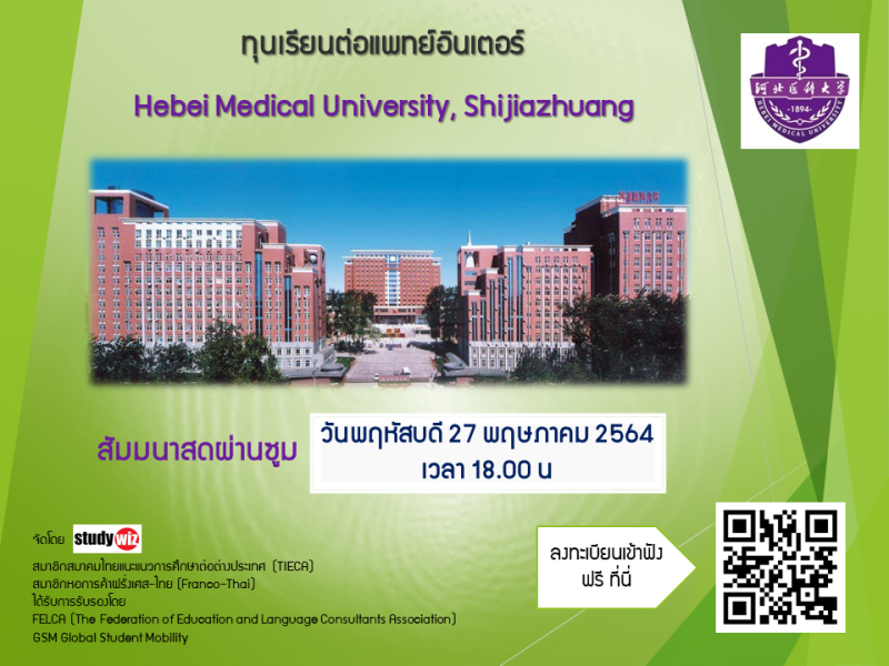 EZ Webmaster May 25, 2021 EZ Webmaster May 25, 2021 เรียนแพทย์อินเตอร์ที่จีน พร้อมลุ้นทุนก่อนเข้าเรียน สนใจเรียนแพทย์อินเตอร์ที่จีน พร้อมลุ้นทุนก่อนเข้าเรียน จาก Hebei Medical University (HMU) สัมมนาผ่านซูม รับฟังข้อมูลกับทางมหาวิทยาลัยโดยตรง วันพฤหัสบดีที่ 27 พฤษภาคม 2564 เวลา 18.00 น. ลงทะเบียนเข้าฟัง ฟรี คลิกที่ลิงก์นี้ได้เลยค่ะ https://bit.ly/342Av8N อ่านรายละเอียดเพิ่มเติมได้ที่ https://bit.ly/342iS91 ขอข้อมูลเพิ่มเติมได้ที่ inbox หรือ T: 0816557044 Line : @studywiz E: china@studywiz.net