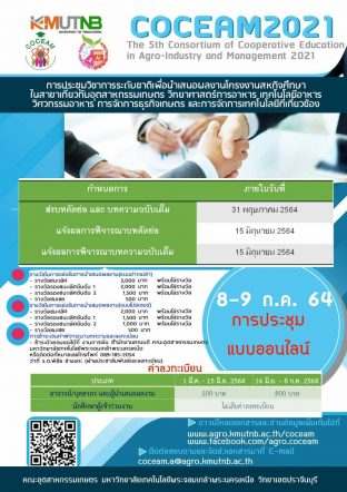 EZ Webmaster May 15, 2021 คณะอุตสาหกรรมเกษตร มจพ. ปราจีนบุรี การประชุมวิชาการ “COCEAM 2021” รูปแบบออนไลน์ EZ Webmaster May 15, 2021 คณะอุตสาหกรรมเกษตร มหาวิทยาลัยเทคโนโลยีพระจอมเกล้าพระนครเหนือ วิทยาเขตปราจีนบุรี กำหนดจัดการประชุมวิชาการ The 5th Consortium of Cooperative Education in Agro-Industry and Management 2021 (COCEAM 2021) ระหว่างวันที่ 8-9 กรกฎาคม 2564 ในรูปแบบออนไลน์ เพื่อเป็นเวทีนำเสนอผลงานสหกิจศึกษาด้านอุตสาหกรรมเกษตร วิทยาศาสตร์การอาหาร วิศวกรรมอาหาร การจัดการธุรกิจเกษตร กำหนดการส่งผลงานบทคัดย่อและบทความฉบับเต็ม (Proceeding) ภายในวันที่ 15 มิถุนายน 2564… Continue Reading