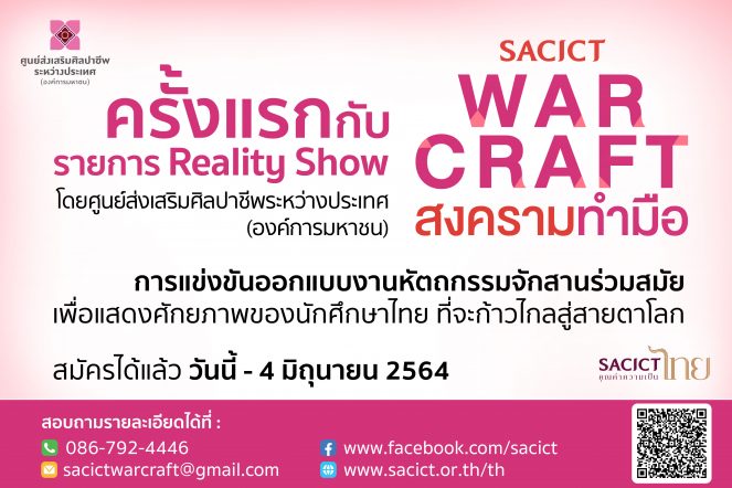 EZ Webmaster May 21, 2021 ศูนย์ส่งเสริมศิลปาชีพระหว่างประเทศ (องค์การมหาชน) ชวนนิสิต นักศึกษา ร่วมแข่งขันรายการ Reality Show “SACICT WAR CRAFT สงครามทำมือ” EZ Webmaster May 21, 2021 ศูนย์ส่งเสริมศิลปาชีพระหว่างประเทศ (องค์การมหาชน) จัดแข่งขันออกแบบผลิตภัณฑ์ศิลปหัตถกรรมร่วมสมัยสู่สากล ประจำปี 2564 เฟ้นหาสุดยอดทีมออกแบบผลิตภัณฑ์จักสานผ่านรายการ Reality Show “SACICT WAR CRAFT สงครามทำมือ” ออกอากาศทางช่องอมรินทร์ทีวี ชวนนิสิต นักศึกษา ที่กำลังศึกษาในระดับปริญญาตรีหรือเทียบเท่า สมัครเข้าร่วมรายการในรูปแบบทีม (ทีมละ 3 คน) เพื่อเปิดประสบการณ์ใหม่ ในรายการ Reality Show แห่งการสร้างสรรค์แรงบันดาลใจ ได้ความรู้ พร้อมแจ้งเกิด ชิงเงินรางวัลรวมมูลค่ากว่า 300,000 บาท พร้อมถ้วยรางวัล สมัครได้แล้วตั้งแต่วันนี้ ถึง 4 มิถุนายน 2564 รายการ “SACICT WAR CRAFT สงครามทำมือ” เป็นการสนับสนุนและพัฒนาศิลปหัตถกรรมไทยให้ก้าวไกลเป็นที่ยอมรับทั้งในประเทศและเวทีหัตถกรรมโลก เน้นการสร้างการรับรู้และสร้างแรงบันดาลใจให้กับกลุ่มเป้าหมาย… Continue Reading