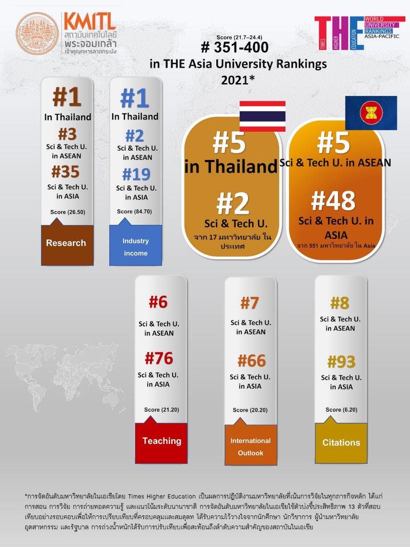 EZ Webmaster June 22, 2021 EZ Webmaster June 22, 2021 ยืนหนึ่ง !! สจล. คว้าอันดับ 1 มหาวิทยาลัยวิจัย ในประเทศไทย ทะยานสู่อันดับ 5 ของในภูมิภาคอาเซียน ด้านวิทย์-เทคโนโลยี สถาบันเทคโนโลยีพระจอมเกล้าเจ้าคุณทหารลาดกระบัง (สจล.) ได้รับการจัดอันดับ ให้เป็น มหาวิทยาลัยวิจัยอันดับ 1 ในประเทศไทย จากมหาวิทยาลัยทั่วเอเชีย โดย Times Higher Education World University Rankings 2021 (Asia-Pacific) ด้วยคะแนน 26.50 สะท้อนจุดแข็งสำคัญในการผลักดันงานวิจัย/นวัตกรรมที่เอื้อประโยชน์ต่อสังคม ตลอดจนยกระดับคุณภาพชีวิตคนไทย พร้อมพ่วง “อันดับหนึ่งด้านรายได้จากภาคอุตสาหกรรม” ด้วยคะแนน 84.70 ความสำเร็จจากการคิดค้น-พัฒนานวัตกรรมใหม่ในวงการวิชาการ และสร้างมูลค่าเพิ่มทางเศรษฐกิจ ตอกย้ำวิสัยทัศน์ The World Master of Innovation นอกจากนี้ สจล. ยังได้รับจัดอันดับ 5 ของภูมิภาคอาเซียน ด้านวิทยาศาสตร์และเทคโนโลยี ศ. ดร.สุชัชวีร์ สุวรรณสวัสดิ์ อธิการบดี สถาบันเทคโนโลยีพระจอมเกล้าเจ้าคุณทหารลาดกระบัง (สจล.) เปิดเผยว่า จากการจัดอันดับ Times Higher Education World University Rankings 2021 (Asia-Pacific) จากมหาวิทยาลัยชั้นนำทั่วเอเชีย สจล. ได้รับการจัดอันดับ 1 ของมหาวิทยาลัยไทยที่มีความโดดเด่นด้านงานวิจัย (Research) ด้วยคะแนน 26.50 สะท้อนจุดแข็งสำคัญของ สจล. ที่สามารถผลักดันงานวิจัย/นวัตกรรมที่เอื้อประโยชน์ต่อสังคม ตลอดจนยกระดับคุณภาพชีวิตคนไทย ภายใต้การบูรณาการองค์ความรู้ที่หลากหลาย อีกทั้งยังเป็นอันดับ 1 ในด้านรายได้จากภาคอุตสาหกรรม (Industry Income) ด้วยคะแนน 84.70 ที่ฉายภาพความสำเร็จของ สจล. ในการพัฒนานวัตกรรมใหม่ให้เกิดขึ้นแก่แวดวงวิชาการ พร้อมทั้งสามารถสร้างมูลค่าเพิ่มทางเศรษฐกิจ ซึ่งนับเป็นการตอกย้ำวิสัยทัศน์ของการเป็น The World Master of Innovation อย่างแท้จริง ขณะที่คะแนนในภาพรวม (Overall Ranking) ด้านวิทยาศาสตร์และเทคโนโลยี (Science & Tech University) สจล. ได้รับการจัดอันดับที่ 5 ของประเทศไทย จาก 17 มหาวิทยาลัยในประเทศ และอันดับ 5 ของภูมิภาคอาเซียน จากทั้งหมด 551 มหาวิทยาลัยในเอเชีย ซึ่งทั้งหมดนี้ เป็นผลให้ สจล. ได้รับการจัดอันดับมหาวิทยาลัยเอเชียที่ 351 – 400 ในช่วงคะแนน 21.7 – 24.4 อย่างไรก็ดี สจล. มีความมุ่งมั่นตั้งใจในการพัฒนาและขับเคลื่อนระบบการศึกษาอย่างต่อเนื่อง ทั้งในมิติของการยกเครื่องหลักสูตรให้เท่าทันต่อการเปลี่ยนแปลงของโลก บ่มเพาะแนวคิดบัณฑิตยุคใหม่ให้มีทักษะความเป็นผู้นำ ที่กล้าคิด ก้าวข้ามขีดจำกัดตนเอง ส่งเสริมการพัฒนางานวิจัยของคณาจารย์นักวิจัย ฯลฯ ดังนั้น “งานวิจัยและการนำงานวิจัยไปใช้ในภาคอุตสาหกรรม” จึงเป็นสิ่งสำคัญในการขับเคลื่อนเศษฐกิจของประเทศ ที่ สจล. มุ่งผลักดันและก้าวสู่การเป็นมหาวิทยาลัยด้านวิทยาศาสตร์และเ