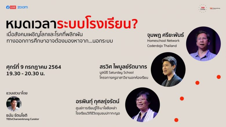EZ Webmaster July 8, 2021 TED Circles “หมดเวลา…ระบบโรงเรียน” EZ Webmaster July 8, 2021 “หมดเวลา…ระบบโรงเรียน?” TED Circles hosted by TEDxCharoenkrung วงสนทนาเพื่อเข้าใจที่มาและหาทางออกของนานาปัญหาสังคม . ศุกร์ที่ 9 กรกฎาคมนี้ 19.30 – 20.30 น. เราอยากชวนคุณมาร่วมกันแลกเปลี่ยนมุมมอง ปัญหาการศึกษาในระบบโรงเรียนของบ้านเรา ที่ต้องเผชิญกับการเปลี่ยนแปลงที่รวดเร็วของโลก . และความไม่แน่นอนจากผลกระทบของ Covid-19 ที่อาจต้องการทางเลือกใหม่ ๆ ที่มองไกลกว่า เพียงการยกห้องเรียนรายวิชามาสู่ออนไลน์ . ทั้งเรื่องการจัดนิเวศการเรียนรู้ และเครือข่ายการศึกษาทางเลือก ให้เหมาะกับผู้เรียนแต่ละคน . การเสริมกระบวนการเรียนรู้ และการสร้างการมีส่วนร่วมของผู้คนชุมชน… Continue Reading