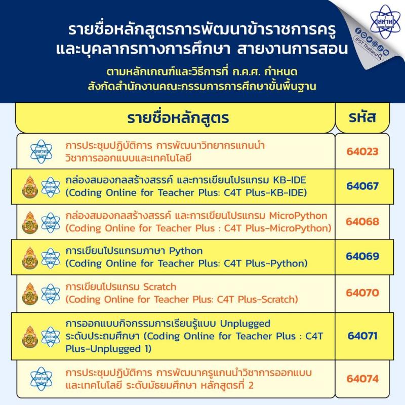 EZ Webmaster August 15, 2021 EZ Webmaster August 15, 2021 เช็ก! 7 หลักสูตรการอบรมจาก สสวท. ที่ผ่านการรับรองจาก ก.ค.ศ. แล้ว ล่าสุด 7 หลักสูตรการอบรม จากสถาบันส่งเสริมการสอนวิทยาศาสตร์และเทคโนโลยี (สสวท.) ได้ผ่านการรับรองจากสำนักงานคณะกรรมการข้าราชการครูและบุคลากรทางการศึกษา (ก.ค.ศ.) แล้ว หลักสูตรการอบรม ทั้ง 7 หลักสูตร ได้แก่ โดยคุณครูที่สนใจสามารถดูรายละเอียดหลักสูตรการอบรมการพัฒนาข้าราชการครูและบุคลากรทางการศึกษา สายงานการสอน ของสำนักคณะกรรมการการศึกษาขั้นพื้นฐาน ตามหลักเกณฑ์และวิธีการที่ ก.ค.ศ. กำหนด ประจำปีงบประมาณ 2564 ครั้งที่ 2/2564 ได้ที่ >>> https://drive.google.com/file/d/