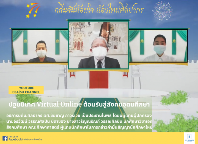 tui sakrapee August 24, 2021 tui sakrapee August 24, 2021 “กลิ่นจันน้อมใจ น้องใหม่ศิลปากร” ปฐมนิเทศ Virtual Online ต้อนรับสู่สังคมอุดมศึกษา มหาวิทยาลัยศิลปากร จัดพิธีปฐมนิเทศนักศึกษาใหม่ “กลิ่นจันน้อมใจ น้องใหม่ศิลปากร” ปีการศึกษา 2564 แบบ Virtual Online ขึ้นเพื่อเป็นการต้อนรับและเตรียมความพร้อมนักศึกษาชั้นปีที่ 1 ให้ตระหนักถึงความสำคัญต่อการศึกษาในระดับอุดมศึกษาที่ต้องเรียนรู้ ปรับตัวสู่สังคมใหม่ รวมถึงแนะนำการบริการเพื่อดูแลนักศึกษาทั้งสวัสดิการและสวัสดิภาพ โดยกำหนดจัดเป็นรูปแบบออนไลน์บนช่องทาง Youtube Channel ของกองกิจการนักศึกษา ในวันเสาร์ที่ 21 สิงหาคม 2564 ตั้งแต่เวลา 09.00 – 16.00 น. ผ่านช่องทาง Youtube DSA|SU Channel พิธีปฐมนิเทศนักศึกษาใหม่ครั้งนี้ได้รับเกียรติจากท่านอธิการบดีมหาวิทยาลัยศิลปากร ผู้ช่วยศาสตราจารย์ชัยชาญ ถาวรเวช เป็นประธานในพิธี และผู้แทนคณาจารย์ในพิธีฝากตัวเป็นศิษย์ โดยมีผู้แทนผู้ปกครองนายจิรวัฒน์ วรรณศิลปิน บิดาของ นางสาวรัญณริณก์ วรรณศิลปิน นักศึกษาวิชาเอกสังคมศึกษา คณะศึกษาศาสตร์ ผู้แทนนักศึกษาในการกล่าวคำมั่นสัญญานักศึกษาใหม่ ทั้งนี้บรรยากาศในกิจกรรมยังมีความสนุกสอดแทรกสาระความรู้ ด้วยกิจกรรมเกมนันทนาการรูปแบบ Game online ซึ่งมีเนื้อหาที่บูรณาการมาจากทักษะการใช้ชีวิต และการปรับตัวสู่รั้วมหาวิทยาลัย สร้างความสัมพันธ์ที่ดีระหว่างพี่น้องชาวศิลปากร โดยได้รับความร่วมมือจากองค์กรนักศึกษา มหาวิทยาลัยศิลปากร ที่มาร่วมสร้างสีสัน ความอบอุ่นให้เหล่าน้องใหม่อีกด้วย กำหนดการและกิจกรรมประกอบไปด้วย ภาคเช้า – พิธีบวงสรวงองค์พระพิฆเนศ – พิธีบายศรีสู่ขวัญและฝากตัวเป็นศิษย์ – ปิติสนทนากิจการนักศึกษา – ศูนย์ระบายศิลป์และเกมนันทนาการ ภาคบ่าย – สโมฯ Onstage (องค์กรนักศึกษา) – กองบริหารงานวิชาการ หัวข้อ “เรียนรู้สร้างสรรค์” – สำนักดิจิทัลและเทคโนโลยี หัวข้อ “เท่าทันเทคโนโลยี” – สำนักหอสมุดกลาง หัวข้อ “วิถีห้องสมุดอุดมฝัน” – พระจันทร์เพชร ศิลปากร “เชิดชูนักกิจกรรมดีเด่น”