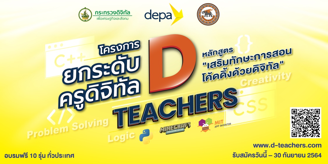 EZ Webmaster August 25, 2021 EZ Webmaster August 25, 2021 depa ร่วมกับ ม.นเรศวร จัดโครงการยกระดับครูดิจิทัล ด้วยหลักสูตร “เสริมทักษะการสอนโค้ดดิ้งด้วยดิจิทัล” ฟรี! สำนักงานส่งเสริมเศรษฐกิจดิจิทัล และ คณะศึกษาศาสตร์ มหาวิทยาลัยนเรศวร จัดโครงการฝึกอบรมหลักสูตร “เสริมทักษะการสอนโค้ดดิ้งด้วยดิจิทัล” เพื่อยกระดับครูดิจิทัลทั่วประเทศ ฟรี ไม่มีค่าใช้จ่าย โครงการดังกล่าวมีวัตถุประสงค์เพื่อให้ครู และบุคลากรทางการศึกษาได้แนวคิด การแก้ปัญหา (Problem Solving) และกิจกรรมเสริมสร้างทักษะทางความคิดเชิงตรรกะ (Logic) สร้างสรรค์ (Creativity) ไม่ว่าจะเป็นการใช้สื่อการสอน Coding ที่ได้มาตรฐาน การปูพื้นฐานทักษะการเขียนโปรแกรมด้วยภาษา Python ซึ่งเป็นภาษาที่เข้าใจง่าย เหมาะสมกับการเรียนรู้ Coding ในปัจจุบัน คุณสมบัติของบุคลากรที่เข้าร่วมโครงการ -เป็นครู หรือบุคลากรทางการศึกษา ในสาระเทคโนโลยี (วิทยาการคำนวณ) กลุ่มสาระการเรียนรู้วิทยาศาสตร์และเทคโนโลยี หรือ สาขาที่เกี่ยวข้อง -รับสมัครหน่วยงานละไม่เกิน 5 ท่าน สำหรับผู้ที่สนใจสมัครเข้าร่วมอบรมสามารถสมัครได้แล้วตั้งแต่วันนี้ – 30 กันยายน 2564 หรือจนกว่าผู้เข้าอบรมจะเต็มจำนวน โดยสามารถสมัครและอ่านรายละเอียดเพิ่มเติมได้ที่ >>> www.d-teachers.com