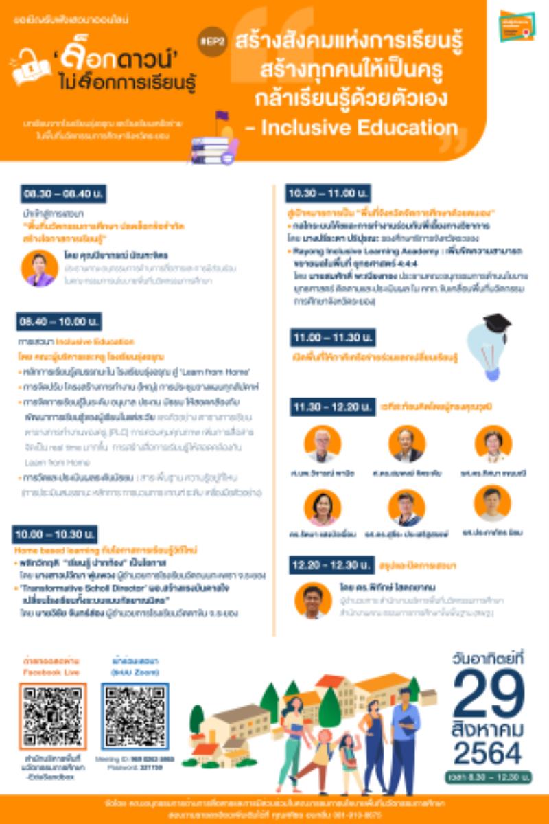 EZ Webmaster August 27, 2021 EZ Webmaster August 27, 2021 การจัดงานเสวนาออนไลน์ “ล็อกดาวน์ ไม่ล็อกการเรียนรู้” ครั้งที่ 2 มูลนิธิสยามกัมมาจลและภาคีเครือข่ายร่วมกับคณะอนุกรรมการด้านการสื่อสารและการมีส่วนร่วมในคณะกรรมการนโยบายพื้นที่นวัตกรรมการศึกษาและสำนักงานบริหารพื้นที่นวัตกรรมการศึกษา ขอเชิญผู้สนใจเข้าร่วมการเสวนาออนไลน์ ‘ล็อกดาวน์’ ไม่ล็อกการเรียนรู้ ครั้งที่ 2 หัวข้อ “สร้างสังคมแห่งการเรียนรู้ สร้างทุกคนให้เป็นครูกล้าเรียนรู้ด้วยตัวเอง”`- Inclusive Education บทเรียนจากโรงเรียนรุ่งอรุณและโรงเรียนเครือข่ายในพื้นที่นวัตกรรมการศึกษาจังหวัดระยอง และการบูรณาการสร้างกลไกร่วมพัฒนาการเรียนรู้ในระดับพื้นที่ วันอาทิตย์ที่ 29 สิงหาคม 2564 เวลา 08.30-12.30 น. ผ่านระบบ Zoom Meeting ( หมายเลขห้อง 969 0263 5865 พาสเวิร์ด 321759) หรือรับชมผ่านเฟซบุ๊กไลฟ์ สำนักบริหารพื้นที่นวัตกรรมการศึกษา-EduSandbox