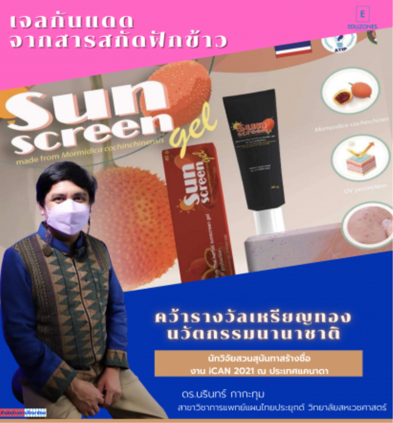 tui sakrapee August 5, 2021 “เจลกันแดดจากสารสกัดฟักข้าว” นักวิจัยสวนสุนันทา คว้าเหรียญทองนวัตกรรมนานาชาติที่แคนาดา tui sakrapee August 5, 2021 อาจารย์ ดร.นรินทร์ กากะทุม อาจารย์ประจำสาขาวิชาการแพทย์แผนไทยประยุกต์ วิทยาลัยสหเวชศาสตร์ และรองผู้อำนวยการฝ่ายปฏิบัติการ ศูนย์แห่งความเป็นเลิศในการดูแลผู้สูงอายุ มหาวิทยาลัยราชภัฏสวนสุนันทา คว้ารางวัลเหรียญทอง จากผลงานวิจัยพัฒนานวัตกรรมผลิตภัณฑ์เจลกันแดดจากสารสกัดฟักข้าว “Sunscreen gel form Momordica cochinchinensis” ซึ่งผลงานดังกล่าวเข้าประกวดและนำเสนอนวัตกรรมสิ่งประดิษฐ์งานวิจัยบนเวทีระดับนาชาติในงาน 6th International Invention Innovation Competition in Canada, iCAN 2021 ณ ประเทศแคนาดา ซึ่งจัดขึ้นเมื่อวันที่ วันที่ 27 กรกฎาคม พ.ศ.2564… Continue Reading