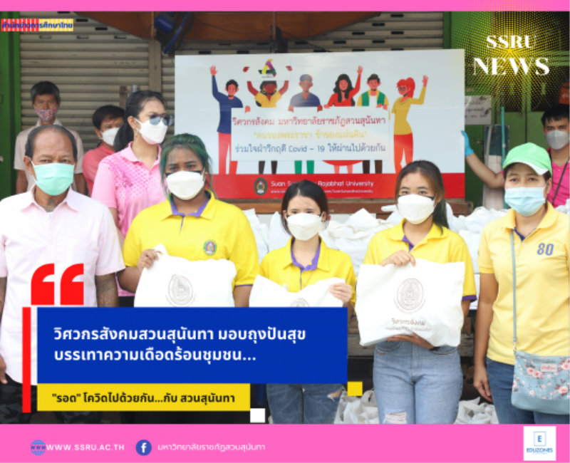 tui sakrapee August 27, 2021 วิศวกรสังคมสวนสุนันทา มอบถุงปันสุขบรรเทาความเดือดร้อนชุมชน tui sakrapee August 27, 2021 วิศวกรสังคมสวนสุนันทามอบถุงปันสุขบรรเทาความเดือดร้อนชุมชน วันอังคารที่ 24 สิงหาคม 2564 มหาวิทยาลัยราชภัฏสวนสุนันทา จัดกิจกรรมมอบถุงปันสุขให้แก่ชุมชน ภายใต้โครงการวิศวกรสังคม ของ พลเอกดาว์พงษ์ รัตนสุวรรณ องคมนตรี เพื่อบรรเทาความเดือดร้อนให้แก่ผู้ได้รับผลกระทบจากสถานการณ์โควิด โดยมีกลุ่มองค์การนักศึกษามหาวิทยาลัยราชภัฏสวนสุนันทา เป็นผู้ดำเนินการจัดกิจกรรมดังกล่าวเพื่อฝึกให้นักศึกษาแสดงออกถึงความเป็นผู้นำในสภาวะวิกฤตเช่นนี้ ฝ่ายประชาสัมพันธ์ : ข่าว Continue Reading
