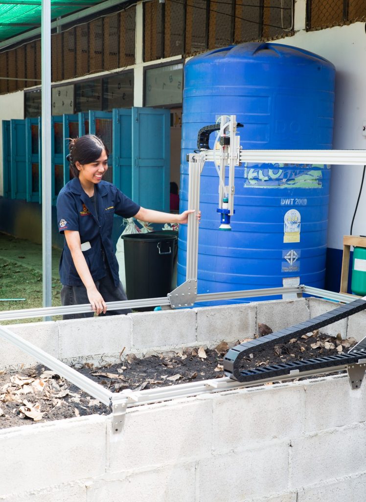 EZ Webmaster September 28, 2021 EZ Webmaster September 28, 2021 “แขนกลรดน้ำแปลงผัก” : งานดีพี่ ป.ตรี เพื่อน้อง ป.5 นักศึกษาวิศวะ ปี 4 มจธ. สร้างอุปกรณ์รดน้ำแปลงผัก เพื่อเป็น “กิจกรรมของจริง” สำหรับการสอนภาคปฏิบัติในสาระการเรียนรู้วิทยาศาสตร์ ระดับ ป.5 ของโรงเรียนประถมชายขอบ จังหวัดราชบุรี ที่นอกจากทำให้เด็กเกิดการเชื่อมโยงวิทยาศาสตร์และเทคโนโลยีเข้ากับชีวิตที่เป็นวิถีชีวิตของเขาแล้ว ยังเป็นงานสร้างวิศวกรที่มองถึงการแก้ปัญหาให้ผู้ใช้งานมากกว่าการแก้ปัญหาเชิงวิศวกรรมอีกด้วย “ออกแบบและเขียนโปรแกรมที่การใช้เหตุผลเชิงตรรกะอย่างง่าย” คือหนึ่งในตัวชี้วัดของกลุ่มสาระการเรียนรู้วิทยาศาสตร์ ของนักเรียนป.5 โดยในหลักสูตรจะกำหนดให้เด็กได้ฝึกปฏิบัติด้วยการหัดเขียนชุดคำสั่ง (Code) ง่ายๆ ในรูปแบบของบล็อกคำสั่ง ทำให้เกิดตัวการ์ตูนบนบนจอคอมพิวเตอร์ เคลื่อนที่ตาม “ชุดคำสั่ง” ที่เด็กเขียน ซึ่งสำหรับเด็กนักเรียนในโรงเรียนที่อยู่ในเมืองจะสามารถเรียนรู้และเชื่อมโยงกับสิ่งรอบตัวได้ไม่ยากนัก แต่สำหรับเด็กที่อยู่นอกเมืองหรืออยู่ในชนบท ที่วิถีชีวิตไม่ค่อยข้องเกี่ยวกับเทคโนโลยีมากนัก หากสามารถเปลี่ยนจากการควบคุมตัวการ์ตูนบนหน้าจอสี่เหลี่ยม ออกมาสู่การควบคุมของที่จับต้องได้ คุ้นเคย และเป็นส่วนหนึ่งในวิถีชีวิตของเขา อาจทำให้พวกเขาสามารถเข้าถึงสาระการเรียนรู้วิทยาศาสตร์ได้มากขึ้น และเป็นส่วนหนึ่งที่ทำให้มีความสนใจหรือไม่ปฏิเสธการเรียนวิทยาศาสตร์และคณิตศาสตร์ได้ นั่นจึงเป็นที่มาของ “ชุดหุ่นยนต์เพื่อการศึกษา การเรียนรู้การเขียนโปรแกรมควบคุมการทำงานของ CNC Smart Farm การเรียนรู้เชิงปฏิบัติการในสถานการณ์โควิด-19 ให้กับโรงเรียนวัดรางเสน่ห์นครจันทร์ อำเภอสวนผึ้ง จังหวัดราชบุรี” ของ น.ส.กิตติกานต์ คงมณี น.ส.ณฐวรรณ ขาวซัง และ น.ส.ณัฏฐ์ชานนท์ นิรภัย 3 นักศึกษาชั้นปีที่ 4 ภาควิชาวิศวกรรมเครื่องกล คณะวิศวกรรมศาสตร์ มหาวิทยาลัยเทคโนโลยีพระจอมเกล้าธนบุรี (มจธ.) โดย project นี้ ได้รับเงินสนับสนุนการดำเนินการจากกองทุนเพื่อความเสมอภาคทางการศึกษา (กสศ.) ภายใต้ชื่อโครงการ โครงการพัฒนาสื่อการเรียนวิชาปฏิบัติผ่านการเรียนออนไลน์ “ก่อนจะเป็นหัวข้อโปรเจกต์นี้ ผมให้โจทย์กับนักศึกษาว่าว่า อยากได้งานที่เกี่ยวกับการสอน coding ที่เหมาะกับเด็กประถม การเขียนชุดคำสั่งเพื่อไปควบคุมอุปกรณ์ ที่จะสามารถสนับสนุนกระบวนการเรียนรู้ให้กับนักเรียนในโรงเรียนแห่งนี้ โดยใช้สิ่งที่รับฟังจากคุณครูในโรงเรียนที่มีนักเรียนมาเป็นข้อมูลสำคัญ เพื่อให้ชิ้นงานที่ได้สามารถตอบความต้