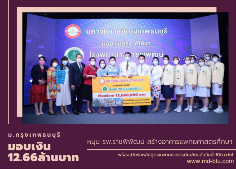tui sakrapee September 24, 2021 ม.กรุงเทพธนบุรี มอบเงิน 12.66 ล้านบาท หนุน รพ.ราชพิพัฒน์ สร้างอาคารแพทยศาสตรศึกษา tui sakrapee September 24, 2021 ม.กรุงเทพธนบุรี มอบเงินบริจาคให้แก่โรงพยาบาลราชพิพัฒน์ 12,660,000 บาท จัดซื้อที่ดินสร้างอาคารศูนย์แพทยศาสตร์ศึกษา เนื่องในการเปิดคณะแพทยศาสตร์ มหาวิทยาลัยกรุงเทพธนบุรี รศ.ดร.บังอร เบ็ญจาธิกุล อธิการบดี มหาวิทยาลัยกรุงเทพธนบุรี มอบเงินบริจาคให้แก่โรงพยาบาลราชพิพัฒน์ในการจัดซื้อที่ดิน สำหรับสร้างอาคารแพทยศาสตร์ศึกษา คณะแพทยศาสตร์ มหาวิทยาลัยกรุงเทพธนบุรี โดยมี นายแพทย์ชัยยศ เด่นอริยะกุล ผู้อำนวยการโรงพยาบาลราชพิพัฒน์ เป็นผู้รับมอบเงินบริจาคดังกล่าว จำนวน 12,660,000 บาท นพ.ชัยยศ เด่นอริยะกุล ผู้อำนวยการโรงพยาบาลราชพิพัฒน์ ในการนี้ นายแพทย์ภูริทัต แสงทองพานิชกุล รองผู้อำนวยการฝ่ายการแพทย์ ผศ.ดร.วิทยา เบ็ญจาธิกุล… Continue Reading