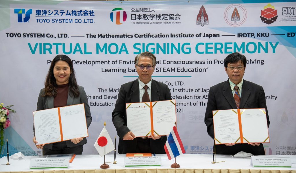 EZ Webmaster October 25, 2021 EZ Webmaster October 25, 2021 มข.MOU 4 ฝ่าย ไทย-ญี่ปุ่น ใช้ STEAM Education สร้างจิตสำนึกทางสิ่งแวดล้อมสู่การพัฒนาอย่างยั่งยืน ตอบโจทย์ SDG สหประชาชาติ สถาบันวิจัยและพัฒนาวิชาชีพครูสำหรับอาเซียน มหาวิทยาลัยขอนแก่น โดย รองศาสตราจารย์ ดร.ไมตรี อินทร์ประสิทธิ์ (กลาง) รองอธิการบดีฝ่ายการศึกษาและบริการวิชาการ รักษาการแทนผู้อำนวยการสถาบันวิจัยและพัฒนาวิชาชีพครูสำหรับอาเซียน ประธานมูลนิธิการศึกษาเพื่อการพัฒนาทักษะการคิด มหาวิทยาลัยขอนแก่น ได้จัดพิธีลงนามในบันทึกข้อตกลงความร่วมมือโครงการ “สร้างจิตสำนึกทางสิ่งแวดล้อม โดยใช้ STEAM Education ในการแก้ปัญหา” 4 หน่วยงาน ระหว่าง TOYO SYSTEM Co., LTD. สถาบันวิจัยและพัฒนาวิชาชีพครูสำหรับอาเซียน มหาวิทยาลัยขอนแก่น The Mathematics Certification Institute of Japan และ มูลนิธิการศึกษาเพื่อการพัฒนาทักษะการคิด ณ ห้องประชุม 402 Smart Classroom มหาวิทยาลัยขอนแก่น รองศาสตราจารย์ ดร.ไมตรี อินทร์ประสิทธิ์ กล่าวว่า โครงการ “สร้างจิตสำนึกทางสิ่งแวดล้อม โดยใช้ STEAM Education ในการแก้ปัญหา” สอดคล้องกับประเด็นยุทธศาสตร์มหาวิทยาลัยในหลายมิติ ประเด็นแรก คือเรื่องการบริการวิชาการแนวใหม่นำมหาวิทยาลัยสู่ความเป็นนานาชาติเสริมสร้างความร่วมมือเพื่อการพัฒนา ตามที่มหาวิทยาลัยขับเคลื่อนการบริการแนวใหม่ จะเคลื่อนย้ายจากการบริการวิชาการจากความรับผิดชอบต่อสังคม Corporate Social Responsibility (CSR) ไปสู่การสร้างคุณค่าร่วม Creating Shared Value (CSV) อย่างยั่งยืน ตอบโจทย์ของ SDG4 ของสหประชาชาติ เรื่องการพัฒนาอย่างยั่งยืน” “ด้านการสร้างคุณค่าร่วม Creating Shared Value (CSV) นั้น บริษัท TOYO SYSTEM ร่วมมือกับทั้งกระทรวงเศรษฐกิจ การค้าและอุตสาหกรรม คณะกรรมการการศึกษาจังหวัด และภาคเอกชน ทำ CSV ในเมืองอิวากิ จังหวัด Fukushima เพื่อฟื้นให้ผู้คนที่ได้รับผลกระทบจากการระเบิดของไฮโดรเจน เมื่อปี 2011 รวมทั้งบริษัทและคนของบริษัทที่อยู่ห่างจากที่ระเบิดไม่เกิน 50 กม. ได้กลับมาใช้ชีวิตในเมืองได้อย่างเป็นปกติ” “การสร้างความตระหนักเกี่ยวกับเรื่องสิ่งแวดล้อม และการคิดทางคณิตศาสตร์เป็นพื้นฐานสำคัญ ที่จะนำมาพัฒนาเทคโนโลยีต่างๆ ไป พร้อมกับการแก้ปัญหาสิ่งแวดล้อม ประเทศไทยก็ได้มีความร่วมมือกับ The Mathematics Certification Institute of Thailand (SUKEN of Thailand) ในการส่งเสริมความสามารถทางคณิตศาสตร์ของเยาวชนไทย เพื่อให้ประเทศไทยเกิดความตระหนัก เกี่ยวกับการพัฒนาเทคโนโลยีในอนาคต โดยถ้าหากขาดการสร้างความตระหนักเรื่องสิ่งแวดล้อม ก็อาจจะประสบปัญหาเหมือนประเทศญี่ปุ่น อาทิเช่น โรค Minamata หรือ โรค Itai-itai ที่เกิดจากสารแคดเมียม และสารปรอท ดังนั้น หน่วยงานทั้ง 4 ฝ่าย จึงมีความตั้งใจอย่างสูงในการทำความร่ว