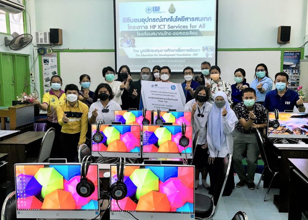 EZ Webmaster November 29, 2021 EZ Webmaster November 29, 2021 มูลนิธิ EDF มอบชุดคอมพิวเตอร์และเครื่องสำรองไฟ โครงการ ICT Service for All มูลนิธิเอชพี และเอชพี อิงค์ (ประเทศไทย) ให้โรงเรียน มูลนิธิ EDF (มูลนิธิกองทุนการศึกษาเพื่อการพัฒนา) สานต่อเจตนารมย์ความมุ่งมั่นของมูลนิธิเอชพี และบริษัทเอชพี อิงค์ (ประเทศไทย) จำกัด ที่เล็งเห็นความสำคัญของการศึกษา เปิดโอกาสให้นักเรียนได้เปิดโลกทัศน์ เรียนรู้นอกกรอบ มีความคิดสร้างสรรค์รู้เท่าทันโลกดิจิทัล มีความรู้ที่หลากหลายและสามารถพัฒนาทักษะด้านต่าง ๆ ล่าสุดเป็นตัวแทนมูลนิธิเอชพี และบริษัทเอชพี อิงค์ (ประเทศไทย) จำกัด มอบชุดคอมพิวเตอร์และเครื่องสำรองไฟ ภายใต้แคมเปญ 40 Days of Doing Good Grant โครงการ ICT Service for All ให้โรงเรียนสมาคมไทย-ออสเตรเลียน อำเภอไทรโยค จังหวัดกาญจนบุรี สังกัดสำนักงานเขตพื้นที่การศึกษาประถมศึกษากาญจนบุรี เขต 3 นอกจากนี้ มูลนิธิเอชพี และเอชพี อิงค์ (ประเทศไทย) ยังได้จัดสรรงบประมาณปรับปรุงห้องปฏิบัติการคอมพิวเตอร์และจัดอบรมให้ความรู้เกี่ยวกับการรู้ดิจิทัล (Digital literacy) แก่นักเรียนระดับชั้นต่าง ๆ ด้วย นายเพิ่มวุฒิ บุบผามาตะนัง รองผู้อำนวยการสำนักงานเขตพื้นที่การศึกษาประถมศึกษากาญจนบุรี เขต 3 กล่าวว่า “นับเป็นช่วงเวลาที่ดีที่ได้เห็นภาคเอกชนเห็นความสำคัญของการศึกษาโดยฉพาะในสถานการณ์การแพร่ระบาดของโรคไวรัส COVID-19 ที่โรงเรียนต้องปรับการเรียนการสอนเป็นในรูปแบบออนไลน์ คอมพิวเตอร์และเครื่องสำรองไฟที่โรงเรียนได้รับมอบจะเป็นประโยชน์อย่างมาก จะเป็นเครื่องมือส่วนหนึ่งเป็นอุปกรณ์ที่สำคัญในการสนับสนุนการศึกษา” นายวีรยุทธ ภานุพินธุ ผู้อำนวยการโรงเรียนสมาคมไทย-ออสเตรเลียน กล่าวว่า “การที่โรงเรียนได้รับการสนับสนุนจากมูลนิธิเอชพี และบริษัทเอชพี อิงค์ (ประเทศไทย) จำกัด ในครั้งนี้นับว่าเป็นช่วงเวลาที่เหมาะสมอย่างยิ่ง สถานการณ์การแพร่ระบาดของโรคไวรัส COVID-19 ทำให้พวกเราทุกคนต้องปรับการเรียนการสอนเป็นออนไลน์ การเรียนด้วยตนเองที่ต้องอาศัยความตั้งใจและความอดทนอย่างมาก การเรียนในรูปแบบที่ต้องอาศัยหรือพึ่งพาพ่อแม่ผู้ปกครองให้เข้ามามีส่วนร่วมด้วย และการเรียนแบบชั้นเรียนออนไลน์ พวกเราคณะครูและนักเรียนขอให้สัญญาว่าพวกเราจะใช้อุปกรณ์ไอซีทีทั้งหมด รวมถึงงบประมาณที่มอบให้อย่างคุ้มค่าที่สุดให้สมเจตนารมย์ขององค์กร รวมทั้งขอขอบคุณมูลนิธิ EDF ที่เป็นหน่วยงานประสานทำให้โรงเรียนของเราได้รับโอกาสดี ๆ เช่นนี้” ทางด้านเด็กหญิงณัฐพร อยู่สาโก นักเรียนชั้นมัธยมศึกษาปีที่ 3 ตัวแทนนักเรียนกล่าวว่า “ในนามของนักเรียนโรงเรีย