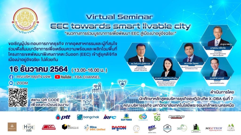 EZ Webmaster December 2, 2021 EZ Webmaster December 2, 2021 คณะบริหารธุรกิจ มจพ. วิทยาเขตระยอง จัดสัมมนาวิชาการแนวทางการบูรณาการเพื่อพัฒนา EEC สู่เมืองน่าอยู่อัจฉริยะ คณะบริหารธุรกิจ มหาวิทยาลัยเทคโนโลยีพระจอมเกล้าพระนครเหนือ วิทยาเขตระยอง โดยนักศึกษาหลักสูตรบริหารธุรกิจดุษฎีบัณฑิต X-DBA รุ่นที่ 7 จัดสัมมนาวิชาการปาฐกถาพิเศษ เรื่อง “ความสำคัญของเมืองน่าอยู่อัจฉริยะ แนวทางการบูรณาการ ร่วมกันของทุกภาคส่วนและผลประโยชน์ที่ประชาชนจะได้รับจากนโยบายเมืองน่าอยู่อัจฉริยะ” ในวันพุธที่ 15 ธันวาคม 2564 เวลา 13.00-16.00 น. ในรูปแบบ Virtual Seminar เพื่อเตรียมความพร้อมและพลิกโฉมพื้นที่โครงการเขตพัฒนาพิเศษภาคตะวันออก (EEC) เข้าสู่ยุคดิจิทัล สู่เมืองน่าอยู่อัจฉริยะ ไปด้วยกัน โดยได้รับเกียรติจาก ฯพณฯ ชวน หลีกภัย ประธานรัฐสภาและประธานสภาผู้แทนราษฎร อดีตนายกรัฐมนตรี ร่วมเป็นองค์ปาฐกรับเชิญกิตติมศักดิ์ และวิทยากรผู้ทรงคุณวุฒิ เพื่อแลกเปลี่ยนเรียนรู้ผ่านมุมมองและแนวคิดในหัวข้อดังนี้ 1. การมีส่วนร่วมของภาคประชาชนกับโครงการพัฒนาของภาครัฐ โดย ดร.สาธิต ปิตุเตชะ รัฐมนตรีช่วยว่าการกระทรวงสาธารณสุขและสมาชิกสภาผู้แทนราษฎร จังหวัดระยอง 4 สมัย 2. มุ่งสู่ศูนย์กลางการลงทุนกับอุตสาหกรรมเป้าหมาย 12 ประเภท โดย คุณสุพันธุ์ มงคลสุธี ประธานสภาอุตสาหกรรมแห่งประเทศไทย 3. ความร่วมมือของภาครัฐและเอกชนในการขับเคลื่อนเศรษฐกิจอัจฉริยะ โดย ดร.ไพรินทร์ ชูโชติถาวร ประธานกรรมการ บริษัท โกลบอล เพาเวอร์ ซินเนอร์ยี่ จำกัด (มหาชน) และรัฐมนตรีช่วยว่าการกระทรวงคมนาคม (พ.ศ. 2560 – 2562) 4. ขับเคลื่อนยุทธศาสตร์เมืองน่าอยู่อัจฉริยะ ยกระดับเศรษฐกิจและอุตสาหกรรมไทย โดย คุณพจณี อรรถโรจน์ภิญโญ ผู้เชี่ยวชาญพิเศษด้านนโยบายและแผนสำนักงานคณะกรรมการนโยบายเขตพัฒนาพิเศษภาคตะวันออก ขอเชิญผู้ประกอบการภาคธุรกิจ ภาคอุตสาหกรรมและผู้ที่สนใจ ร่วมฟัง รับชมผ่านช่องทาง Facebook : คณะบริหารธุรกิจ มจพ. และผู้สนใจเข้าร่วมงาน โดย Scan QR Code เพื่อลงทะเบียนเข้าร่วมผ่านระบบ Zoom ลิงก์ https://forms.gle/oNkvxkzNNQwFeLSi6 รายละเอียดเพิ่มเติมได้ที่ http://fbakm.com Facebook : คณะบริหารธุรกิจ มจพ. วิทยาเขตระยอง โทรศัพท์ 038-627-021 , 061-583-0775 , 065-641-5585 YouTube : FBA CHANNEL