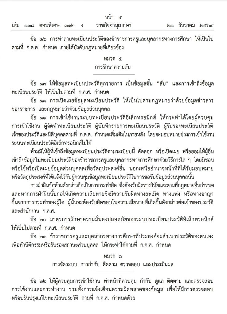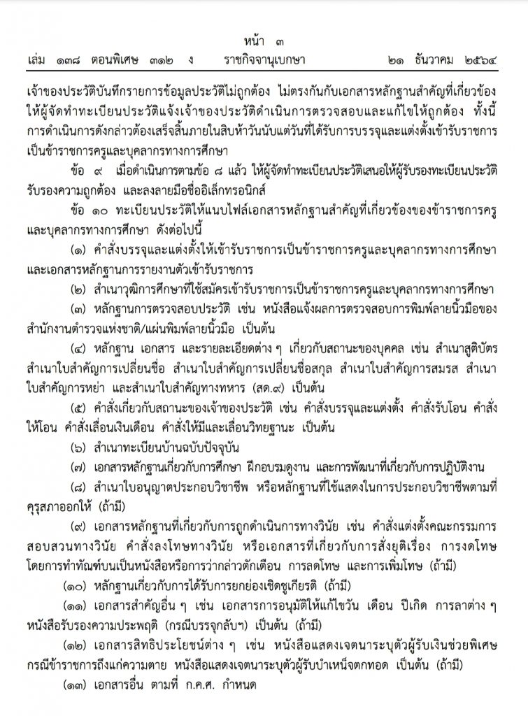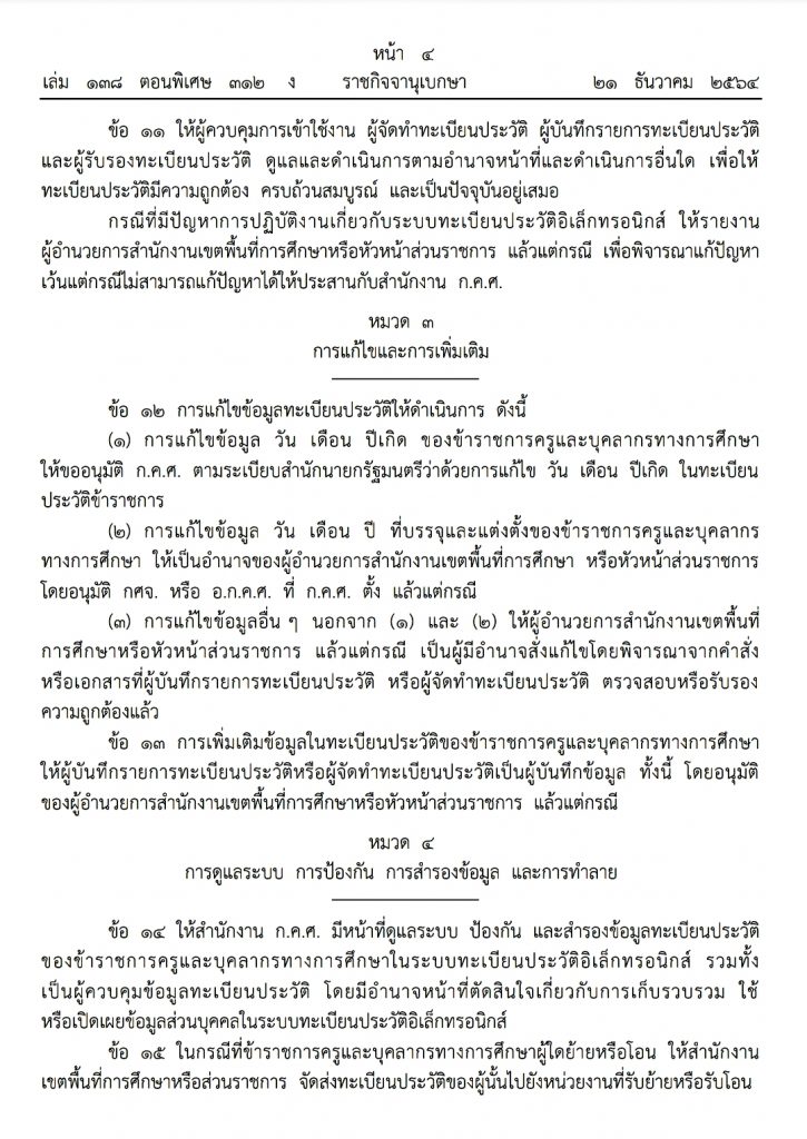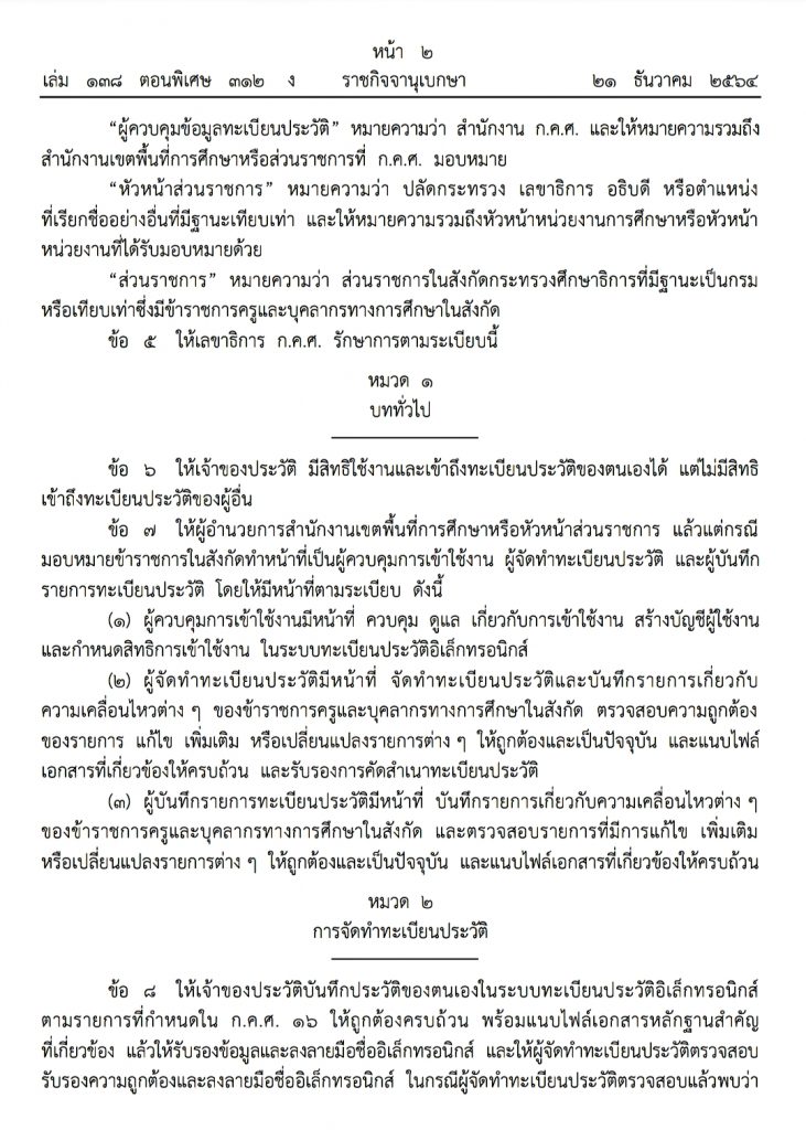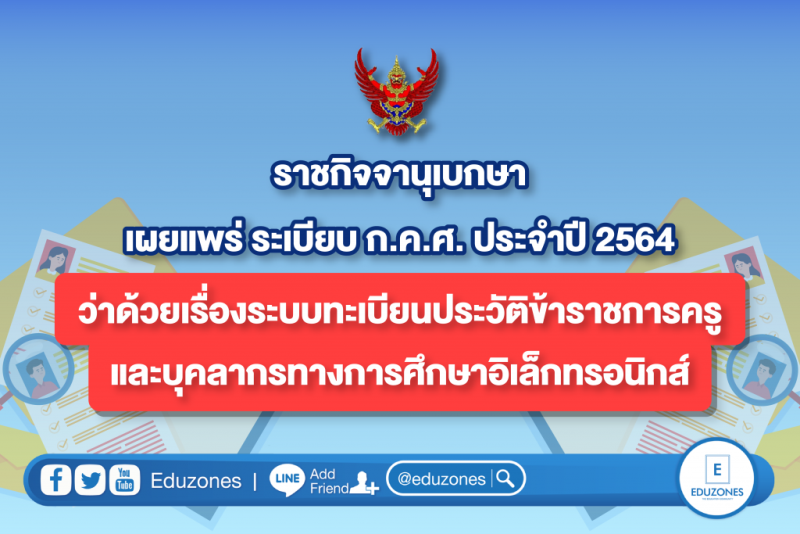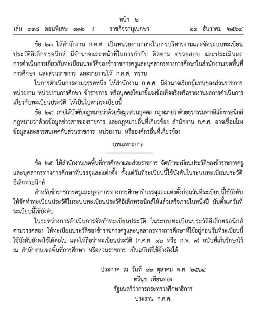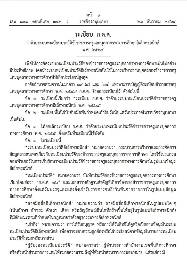 EZ Webmaster December 24, 2021 EZ Webmaster December 24, 2021 ราชกิจจานุเบกษา เผยแพร่ ระเบียบ ก.ค.ศ. ประจำปี 2564 ว่าด้วยเรื่องระบบทะเบียนประวัติข้าราชการครูและบุคลากรทางการศึกษาอิเล็กทรอนิกส์ เมื่อวันอังคาร ที่ 21 ธันวาคม 2564 ที่ผ่านมา ราชกิจจานุเบกษา ได้เผยแพร่ระเบียบสำนักงานคณะกรรมการข้าราชการครูและบุคลากรทางการศึกษา ประจำปี 2564 ว่าด้วยเรื่องระบบทะเบียนประวัติข้าราชการครูและบุคลากรทางการศึกษาอิเล็กทรอนิกส์ โดยได้มีการลงนามอย่างเป็นทางการจากรัฐมนตรีว่าการกระทรวงศึกษาธิการ ในฐานะประธาน ก.ค.ศ. นางสาวตรีนุช เทียนทอง ระเบียบ ก.ค.ศ. ว่าด้วยระบบทะเบียนประวัติข้าราชการครูและบุคลากรทางการศึกษา ประจำปี 2555 จะถูกยกเลิกใช้เมื่อพ้นกำหนดครบ 90 วัน นับจากราชกิจจานุเบกษาประกาศและบังคับใช้ระเบียบ ก.ค.ศ. ประจำปี 2564 ว่าด้วยระบบทะเบียนประวัติข้าราชการครูและบุคลากรทางการศึกษาอิเล็กทรอนิกส์ วัตถุประสงค์ของการจัดตั้ง เพื่อให้การจัดระบบทะเบียนประวัติของข้าราชการครูและบุคลากรทางการศึกษาเป็นไปอย่างมีประสิทธิภาพ โดยนำระบบทะเบียนประวัติอิเล็กทรอนิกส์ไปใช้ในการบริหารงานบุคคลของข้าราชการครูและบุคลากรทางการศึกษาให้เกิดประโยชน์สูงสุด ที่มา : http://www.ratchakitcha.soc.go.th/DATA/PDF/2564/E/312/T_0001.PDF