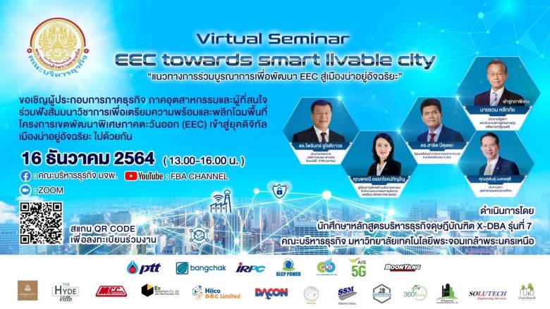 EZ Webmaster December 2, 2021 คณะบริหารธุรกิจ มจพ. วิทยาเขตระยอง จัดสัมมนาวิชาการแนวทางการบูรณาการเพื่อพัฒนา EEC สู่เมืองน่าอยู่อัจฉริยะ EZ Webmaster December 2, 2021 คณะบริหารธุรกิจ มหาวิทยาลัยเทคโนโลยีพระจอมเกล้าพระนครเหนือ วิทยาเขตระยอง โดยนักศึกษาหลักสูตรบริหารธุรกิจดุษฎีบัณฑิต X-DBA รุ่นที่ 7 จัดสัมมนาวิชาการปาฐกถาพิเศษ เรื่อง “ความสำคัญของเมืองน่าอยู่อัจฉริยะ แนวทางการบูรณาการ ร่วมกันของทุกภาคส่วนและผลประโยชน์ที่ประชาชนจะได้รับจากนโยบายเมืองน่าอยู่อัจฉริยะ” ในวันพุธที่ 15 ธันวาคม 2564 เวลา 13.00-16.00 น. ในรูปแบบ Virtual Seminar เพื่อเตรียมความพร้อมและพลิกโฉมพื้นที่โครงการเขตพัฒนาพิเศษภาคตะวันออก (EEC) เข้าสู่ยุคดิจิทัล สู่เมืองน่าอยู่อัจฉริยะ ไปด้วยกัน โดยได้รับเกียรติจาก ฯพณฯ ชวน หลีกภัย ประธานรัฐสภาและประธานสภาผู้แทนราษฎร… Continue Reading
