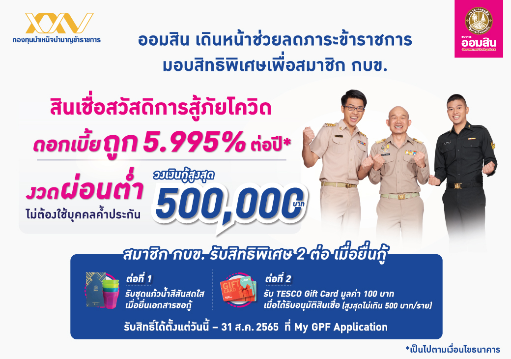 EZ Webmaster July 1, 2022 EZ Webmaster July 1, 2022 กบข. ร่วมกับ ออมสิน จัดโปรโมชันเพื่อสมาชิก กบข. ในโครงการสินเชื่อสวัสดิการสู้ภัยโควิด คิดดอกเบี้ยถูก งวดผ่อนต่ำ ไม่ต้องใช้บุคคลค้ำ กบข. ร่วมกับ ออมสิน จัดโปรโมชันเพื่อสมาชิก กบข. ในโครงการสินเชื่อสวัสดิการสู้ภัยโควิด คิดดอกเบี้ยถูก งวดผ่อนต่ำ ไม่ต้องใช้บุคคลค้ำ กบข. ร่วมกับ ธนาคารออมสิน จัดโปรโมชันเพื่อสมาชิก กบข. สินเชื่ออัตราดอกเบี้ยต่ำสุด 5.995% วงเงินกู้สูงสุด 5 แสนบาท ผ่อนนาน 10 ปี โดยไม่ต้องใช้บุคคลค้ำ พร้อมสิทธิพิเศษสำหรับสมาชิก กบข. รับของที่ระลึกเมื่อติดต่อยื่นกู้ หวังช่วยลดความเดือนร้อนด้านสภาพคล่องของสมาชิก ดร.ศรีกัญญา ยาทิพย์ เลขาธิการคณะกรรมการกองทุนบำเหน็จบำนาญข้าราชการ (กบข.) เปิดเผยว่า ที่ผ่านมา สมาชิก กบข. ได้ให้ความสนใจสวัสดิการทางการเงินอย่างต่อเนื่อง จากสถิติการใช้สวัสดิการในปี 2564 ที่ผ่านมา พบว่ามีอัตราการใช้สวัสดิการทางการเงินสูงเป็นอันดับที่ 3 รองลงมาจากสวัสดิการด้านไลฟ์สไตล์และประกัน ดังนั้น กบข. จึงได้ร่วมมือกับธนาคารออมสิน จัดโปรโมชันสินเชื่อสวัสดิการสู้ภัยโควิด เพื่อสมาชิก กบข. ซึ่งเป็นอีกหนึ่งทางเลือกให้แก่สมาชิก คาดว่าจะสามารถช่วยบรรเทาความเดือดร้อนให้กับสมาชิก กบข. ที่ได้รับผลกระทบจากการแพร่ระบาดของเชื้อไวรัสโควิด-19 ทำให้รายได้ของครอบครัวลดลง ด้วยข้อเสนออัตราดอกเบี้ยเงินกู้ของธนาคารออมสินที่ต่ำกว่าสินเชื่อประเภทเดียวกันของสถาบันการเงินอื่น และงวดผ่อนชำระต่ำเป็นพิเศษ ซึ่งจะช่วยลดภาระค่าใช้จ่ายต่อเดือนกรณีที่สมาชิกนำเงินกู้ไปชำระหนี้ประเภทอื่นที่มีอยู่ก่อนหน้านี้ หรือผู้ที่ประสงค์จะกู้ใหม่สำหรับแบ่งเบาภาระค่าใช้จ่ายจำเป็นในชีวิตประจำวัน ก็ได้รับสิทธิประโยชน์ตามเงื่อนไขพิเศษนี้เช่นเดียวกัน โดยสมาชิก กบข. ที่ยื่นขอสินเชื่อภายในกำหนดระยะเวลาโปรโมชัน จะได้รับของที่ระลึกทุกท่านเมื่อติดต่อยื่นกู้ และสิทธิพิเศษต่อที่ 2 รับ Tesco Gift Card สูงสุด 500 บาท/คน เมื่อสินเชื่อได้รับอนุมัติ ด้านนายวิทัย รัตนากร ผู้อำนวยการธนาคารออมสิน กล่าวว่า ธนาคารออมสินได้จัดทำโครงการสินเชื่อผ่อนปรนหลักเกณฑ์การพิจารณาอนุมัติ พร้อมให้เงื่อนไขพิเศษในการกู้ เพื่อช่วยเพิ่มสภาพคล่อง บรรเทาความเดือดร้อนของประชาชนมาอย่างต่อเนื่อง หลากหลายโครงการ ครอบคลุมอาชีพต่าง ๆ ทั้งที่เป็นแรงงานในระบบ ผู้ประกอบอาชีพอิสระ ผู้ประกอบการรายย่อย รวมถึงข้าราชการ หรือบุคลากรของรัฐ ที่ปัจจุบันกลุ่มอาชีพบุคลากรของรัฐสามารถยื่นขอกู้ในโครงการ สินเชื่อสวัสดิการ “สู้ภัยโควิด” ที