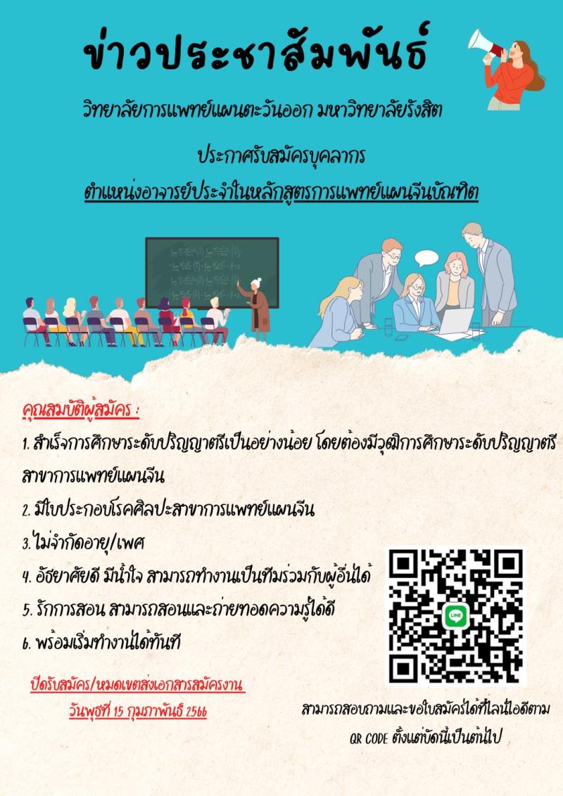EZ Webmaster January 20, 2023 EZ Webmaster January 20, 2023 ว.การแพทย์แผนตะวันออก ม.รังสิต เปิดรับสมัครอาจารย์ประจำหลักสูตรการแพทย์แผนจีนบัณฑิต วิทยาลัยการแพทย์แผนตะวันออก มหาวิทยาลัยรังสิต ประกาศรับสมัครบุคลากร ตำแหน่งอาจารย์ประจำในหลักสูตรการแพทย์แผนจีนบัณฑิต โดยมีคุณสมบัติดังนี้ สำเร็จการศึกษาระดับปริญญาตรีเป็นอย่างน้อย โดยต้องมีวุฒิการศึกษาระดับปริญญาตรีสาขาการแพทย์แผนจีน มีใบประกอบโรคศิลปะสาขาการแพทย์แผนจีน ไม่จำกัดอายุ/ เพศ อัธยาศัยดี มีน้ำใจ สามารถทำงานเป็นทีมร่วมกับผู้อื่นได้ รักการสอน สามารถสอนและถ่ายทอดความรู้ได้ดี พร้อมเริ่มทำงานได้ทันที ทั้งนี้ ปิดรับสมัครและหมดเขตส่งเอกสารสมัครงาน วันพุธที่ 15 กุมภาพันธ์ 2566 สำหรับผู้ที่สนใจสามารถสอบถามรายละเอียดเพิ่มเติม โทร. 0-2791-6000 ต่อ 5169
