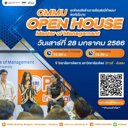EZ Webmaster January 25, 2023 CMMU จัดกิจกรรมเปิดบ้าน ชี้ทางเพื่อคนอยากเรียนต่อปริญญาโท EZ Webmaster January 25, 2023 วิทยาลัยการจัดการ มหาวิทยาลัยมหิดล หรือ ซีเอ็มเอ็มยู (CMMU) จัดกิจกรรม เปิดบ้าน Open House ชี้ทางผู้ที่ต้องการศึกษาต่อในระดับปริญญาโท เพื่อค้นหาหลักสูตรและสาขาที่ตรงใจสำหรับใช้ในการทำงาน พร้อมชวนสัมผัสบรรยากาศการเรียนการสอน สถานที่เรียนจริง รับชมเทคโนโลยีและสื่อที่ใช้ในการเรียน พร้อมด้วยคำแนะนำด้านการวางแผนศึกษาต่อในระดับปริญญาโทจากผู้เชี่ยวชาญด้านการศึกษาต่อที่มีประสบการณ์มากกว่า 10 ปี และรับคำปรึกษาเรื่องทุน ไขทุกข้อสงสัยด้านการเรียนต่อปริญญาโท พูดคุยกับอาจารย์หัวหน้าสาขาแบบตัวต่อตัว ไม่ว่าจะเป็นวิชาเรียน วิธีการเรียน รวมถึงโอกาสจากการศึกษาปริญญาโท ทั้งนี้ กิจกรรมดังกล่าว จะจัดขึ้นในวันเสาร์ที่ 28 มกราคม 2566 ณ อาคารมิว วิทยาลัยการจัดการ… Continue Reading