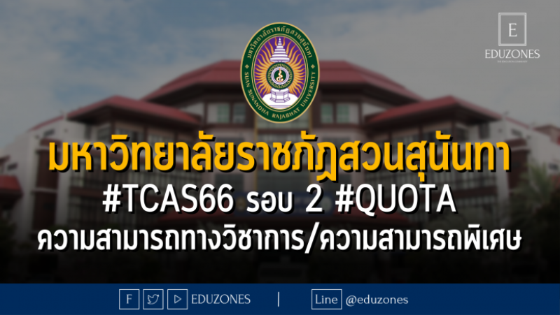 EZ Webmaster February 21, 2023 มหาวิทยาลัยราชภัฏสวนสุนันทา #TCAS66 รอบ 2 #QUOTA ความสามารถทางวิชาการ/ความสามารถพิเศษ – หมดเขต 30 มีนาคม 2566 EZ Webmaster February 21, 2023 มหาวิทยาลัยราชภัฏสวนสุนันทา ประกาศรับ#TCAS66 รอบ 2 #QUOTA ความสามารถทางวิชาการ/ความสามารถพิเศษ – หมดเขต 30 มีนาคม 2566 . จำนวนรับ 3,287 ที่นั่ง ครุศาสตร์บัณฑิต 42 ที่นั่ง เทคโนโลยีอุตสาหกรรม 30 ที่นั่ง วิทยาศาสตร์และเทคโนโลยี 30 ที่นั่ง เทคโนโลยีอุตสาหกรรม 270 ที่นั่ง มนุษยศาสตร์และสังคมศาสตร์ 240 ที่นั่ง ศิลปกรรมศาสตร์ 240… Continue Reading