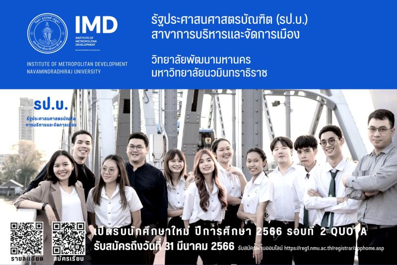 EZ Webmaster March 21, 2023 EZ Webmaster March 21, 2023 มหาวิทยาลัยนวมินทราธิราช เปิดรับสมัครนักศึกษาใหม่ ปีการศึกษา 2566 TCAS รอบ 2 มหาวิทยาลัยนวมินทราธิราช เปิดรับสมัครนักศึกษาใหม่ ปีการศึกษา 2566 TCAS รอบ 2 Quota สมัครได้ถึงวันที่ 31 มีนาคม 2566 ข้อมูลการรับสมัครหลักสูตรรัฐประศาสนศาสตรบัณฑิต สาขาวิชาการบริหารและจัดการเมือง วิทยาลัยพัฒนามหานคร มหาวิทยาลัยนวมินทราธิราช https://web.facebook.com/imdnmu/posts/pfbid02ADGMn9r8fxUVYEzprC9J3SYLkW1TUgtqSL1UNJe9TbamLsj7EkHhd4svhfXC2rG1l รายละเอียดเพิ่มเติมเกี่ยวกับหลักสูตร https://imd.nmu.ac.th/bpa-urban-administration-and…/ . ข้อมูลเพิ่มเติม https://reg1.nmu.ac.th/registrar/apphome.asp