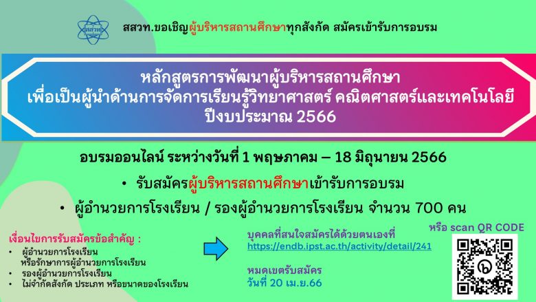 EZ Webmaster March 9, 2023 สสวท. เร่งสร้างผู้นำจัดการเรียนรู้วิทย์ คณิต เทคโนโลยี เดินหน้าจัดอบรมใหญ่ผู้บริหารสถานศึกษาทุกสังกัด สมัครฟรีถึง 20 เมษายนนี้ EZ Webmaster March 9, 2023 สถาบันส่งเสริมการสอนวิทยาศาสตร์และเทคโนโลยี (สสวท.) ขอเชิญผู้บริหารสถานศึกษาทุกสังกัด อบรมหลักสูตรการพัฒนาผู้บริหารสถานศึกษาเพื่อเป็นผู้นำด้านการจัดการเรียนรู้วิทยาศาสตร์ คณิตศาสตร์และเทคโนโลยี ปีงบประมาณ 2566 อบรมออนไลน์ฟรีผ่านโปรแกรม Zoom ระหว่างวันที่ 1 พฤษภาคม – 18 มิถุนายน 2566 จำนวนในการอบรม 30 ชั่วโมง สมัครได้ตั้งแต่บัดนี้หมดเขตรับสมัคร 20 เมษายน 2566 ดูรายละเอียดและสมัครที่ https://endb.ipst.ac.th/activity/detail/241 การอบรมหลักสูตรนี้มุ่งให้ผู้บริหารสถานศึกษาได้รับองค์ความรู้ สามารถประยุกต์องค์ความรู้ในการพัฒนาคุณภาพการจัดการเรียนรู้ในโรงเรียนได้อย่างเป็นรูปธรรม และสร้างเครือข่ายผู้บริหารเพื่อการแลกเปลี่ยนเรียนรู้อย่างกว้างขวางอีกด้วย Continue Reading