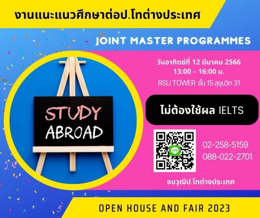 EZ Webmaster March 7, 2023 ม.รังสิต จัดกิจกรรม Joint Master Programmes Open House & Fair 2023 EZ Webmaster March 7, 2023 RSU Study Abroad วิทยาลัยนานาชาติ มหาวิทยาลัยรังสิต จัดกิจกรรม Joint Master Programmes Open House & Fair 2023 เรียนต่อที่ไหนดี? งานนี้จัดเต็มคาราเบล! ในวันอาทิตย์ที่ 12 มีนาคม 2566 เวลา 13:00 – 16:00 น. ณ ชั้น 15 RSU Tower สุขุมวิท 31 (BTS พร้อมพงษ์) สำหรับผู้ที่สนใจสามารถลงทะเบียนเข้าร่วมงานฟรี ได้ที่ https://bit.ly/3nKSqIQ หรือดูรายละเอียดเพิ่มเติมได้ที่ http://www.rsustudyabroad.com/news/306 Continue Reading